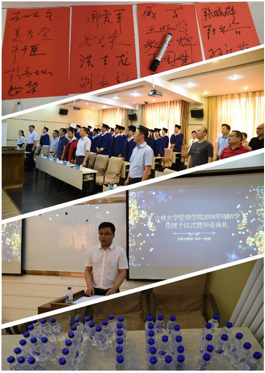 第三项由赵树宽经理为毕业生致辞。首先他代表管理公司向光临本次毕业典礼的各位来宾表示热烈的欢迎,向取得硕士学位的管理公司2013、2014级EMBA学员表示热烈的祝贺。经理在肯定了每位学员的不懈努力,以特有的毅力品质克服了工作及事业方面的诸多困难取得优异成绩的同时,对所有EMBA毕业生与在读学员提出了三点新要求:1、“千年暗室,一灯即明”。 经理希望大家今天毕业于吉大管院EMBA,日后也要养成并保持学习的能力。只有坚持学习才能有助于加快知识更新、优化知识结构、拓宽眼界和视野,从而增强工作的科学性、预见性,在时代浪潮中赢得主动、赢得优势、赢得未来;2、“为学之实,固在践履。苟徒知而不行,诚与不学无异。”经理希望每位管院EMBA毕业生牢记吉大管院EMBA“近贤达、破格局、论恒越之道”的初心,将所学到的知识和才华无私地奉献给国家的富强与民族的振兴事业,做到一个真正具有工匠精神的企业家。3.心系母校。“既入管院门,终为吉大人”希望每个人律己隆法,修身明德,不辱使命,不负重托。