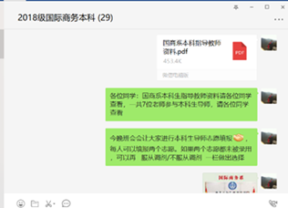 国商系的老师们将员工报名情况进行统计和整理,基于员工的意愿结合老师的要求、员工所希望得到的指导和未来规划,完成了老师和员工的选配,并将选配结果分别通知给老师和员工。国际商务系共八名教授承担指导老师工作,其中有六名博士生导师,两名硕士生导师。目前指导老师和员工都已经通过微信建立联系或已建群,并已经开始指导工作,这对疫情期间同学们的学习和成长无疑有起到了更大的帮助和引导。