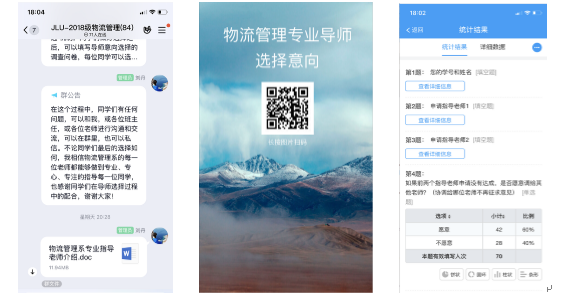 3月22日晚8点物流管理系16位专业导师和物流管理专业本科生69人共同在QQ群上召开了本科生导师双选主题班会,让员工充分了解专业导师选择的目的、意义及方案实施的具体安排。同时,员工也可以和所有的专业导师进行互动,通过充分的沟通和交流,加强员工和导师之间的相互了解;并借助问卷星平台让员工填写导师选择志愿和要求、希望获得的指导或机会及未来的规划和打算。最后给员工三天时间,在认真考虑之后填写导师意向选择的调查问卷。