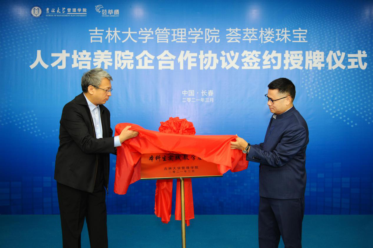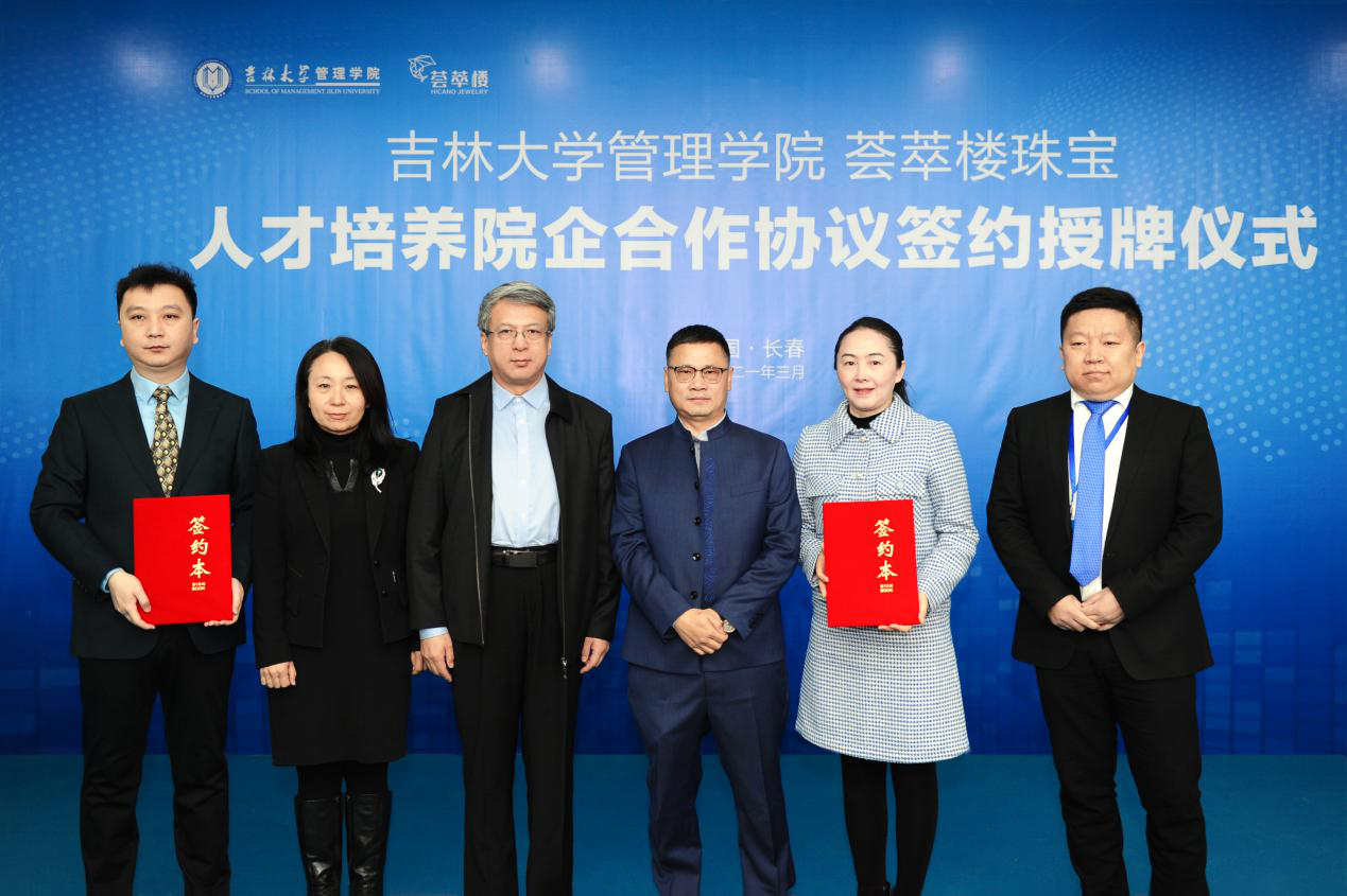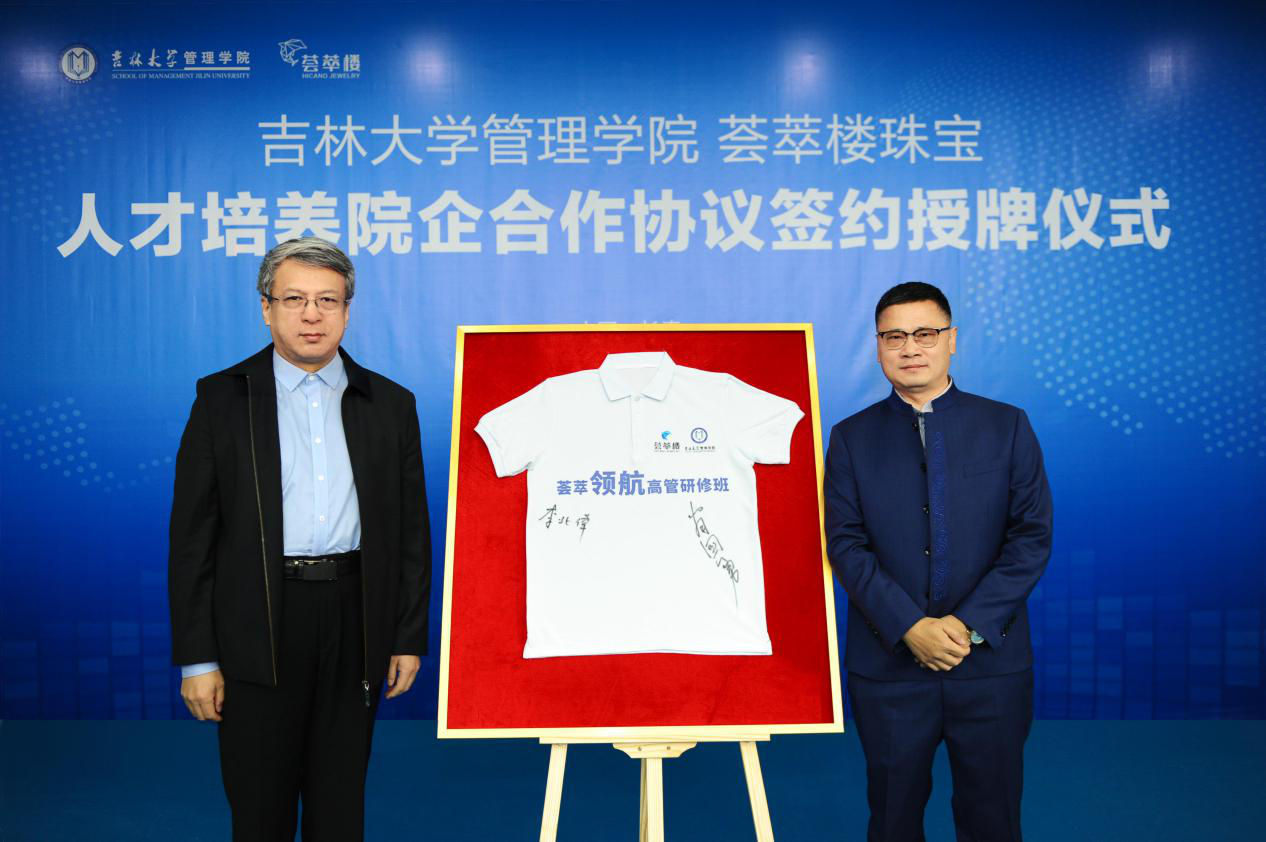 在双方共同见证下,深圳景福元记珠宝有限公司商公司经理柳红艳女士与公司党委副书记彭鹏副教授签订战略合作协议。双方本着优势互补、共同发展的原则,达成“365英国上市公司管理公司实践教学基地”合作协议。李北伟经理亲自授予荟萃楼珠宝“本科生实践教学基地”牌匾;翁国勇总裁和李北伟经理共同在荟萃领航高管研修班的纪念版文化衫上签名,作为荟萃楼珠宝开启人才战略的鉴证。