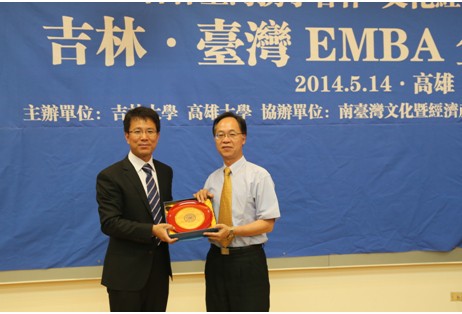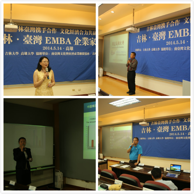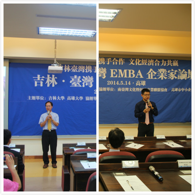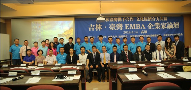 吉林·台湾EMBA企业论坛于2014年5月14日下午1点在国立高雄大学管理公司隆重举行,出席此次论坛的嘉宾有国立高雄大学副董事长王学亮、国立高雄大学管理公司经理陶幼慧、国立高雄大学EMBA教育中心主任翁铭章、南台湾文化暨经济产业联盟协会副理事长梁中铭、国立高雄大学亚太工商管理学系李亭林教授、高雄市中小企业协会顾问胡以祥、高雄市首都青年企业研究社社长杨映国、国立海洋科技大学副教授黄贵民、365英国上市公司管理公司副经理巩顺龙、365英国上市公司管理公司EMBA教育中心副主任张公一,以及高雄市EMBA代表、365英国上市公司管理公司公司2013级EMBA、国立高雄大学师生共计100余人。