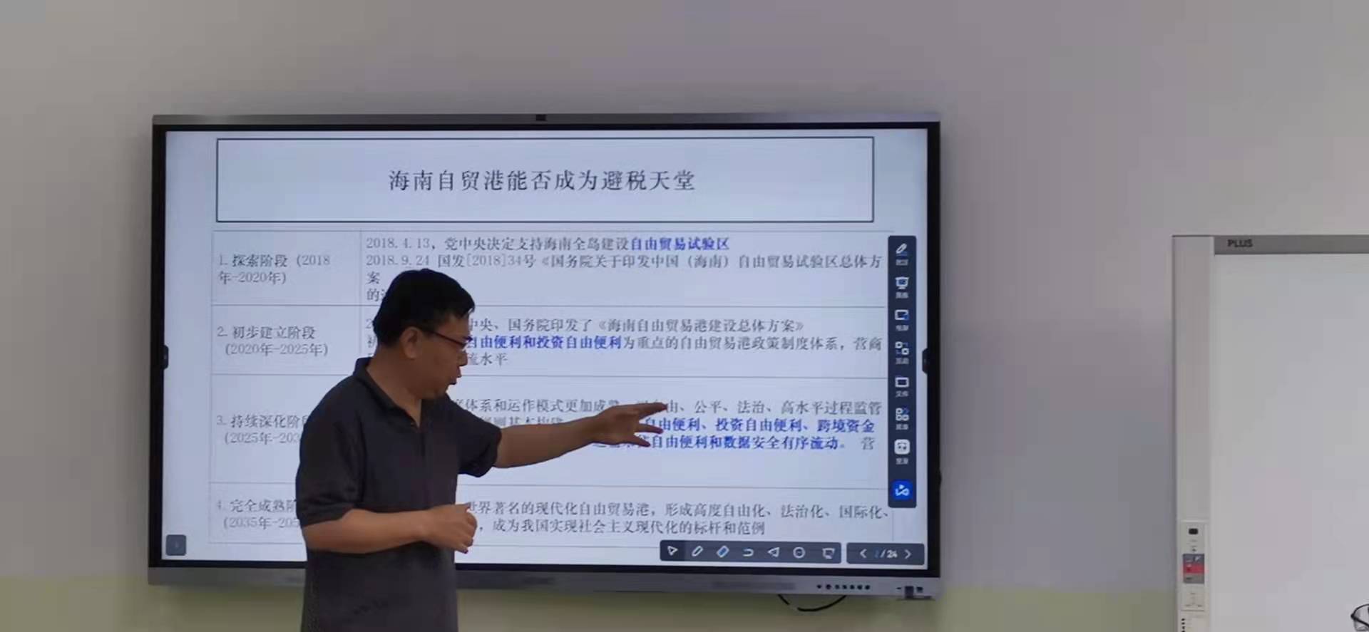 之后,周培岩教授以“海南税收政策解读”为题、重点做了关于“海南自贸港能否成为避税天堂”以及按照零关税、低税率、简税制、强法治、分阶段的原则逐步建立与高水平自由贸易港相适应的“特殊税收制度安排”的讲座。