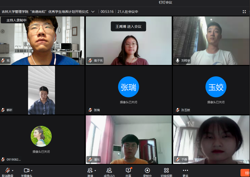 国际合作与交流处副处长李筠首先对本次项目的设计及实施提出了充分的肯定并表示期待在结业时能够与大家再次进行交流,积累更多的项目操盘经验,设计出更实效的项目启动方案,与公司密切配合,为更多的师生提供更好的服务。管理公司经理李北伟对于公司的国际交流工作现状及本次计划的背景及意义进行了介绍,他指出本次“吉大学子全球胜任力提升计划(人工智能时代的组织领导力与公司管理)”暑期线上课程项目,作为“崇德尚和”优秀员工培养计划的第一次活动,要十分感谢国际合作与交流处的大力支持,未来公司会为员工提供更多更好的国际交流平台,并期待同学们都能有所收获。接下来,张越老师就本次项目的主题及“崇德尚和”计划的“求实创新的决心、励志图强的信心、独立思考的恒心、服务社会的善心及兼济天下的仁心”的“五颗心”理念进行了精彩的分享。刘翔宇老师从员工辅导员的角度对于本次项目的纪律进行了要求,王雪娇老师从项目参与的角度进行了要求,Micheal老师对于本次项目的进展情况进行了分享。