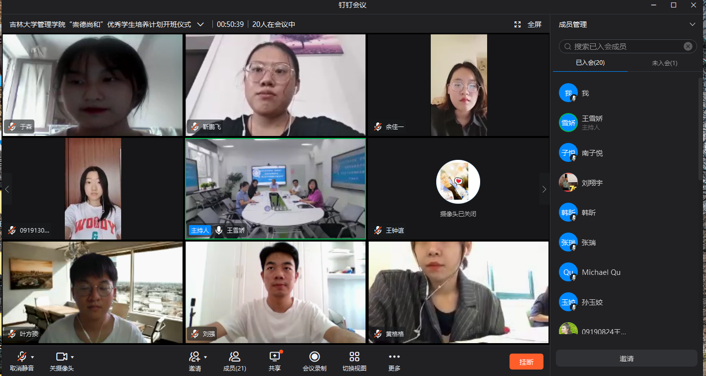 国际合作与交流处副处长李筠,管理公司经理李北伟,管理公司副经理张公一,管理公司副教授张越,管理公司外事秘书王雪娇现场参加了本次仪式。管理公司党委副书记兼副经理彭鹏,员工辅导员刘翔宇,项目负责人Micheal和暑期项目全体25名员工通过钉钉会议在线上参加了本次活动。活动由管理公司副经理张公一主持。