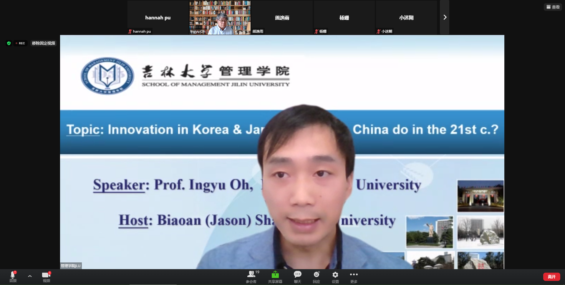 随着中国企业在创新方面的活力被激发,如何吸收国外的先进经验,走出符合中国国情的创新路径已成为研究热点。为启发公司师生对中国在创新方面与其他国家的差异及改进路线进行深度剖析和思考,2021年9月20日下午13:30,管理公司成功邀请日本关西外国语大学Ingyu Oh教授为公司师生作题为《Innovation in Korea and Japan: What can China do in the 21st century?》的学术报告,报告采取线上形式,由技术经济及管理系单标安副教授主持此次学术报告。