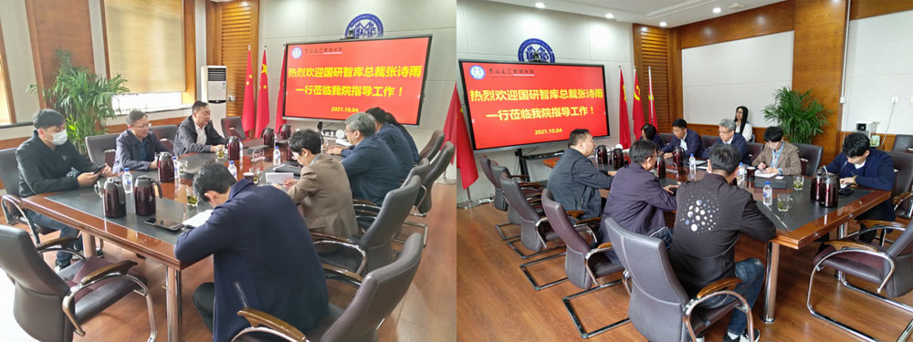 李北伟经理首先就公司整体情况及智库建设工作做简要介绍,李雪灵副经理就公司“十三五”科研情况及服务社会等方面做以汇报。随后,张诗雨总裁介绍了国研智库。