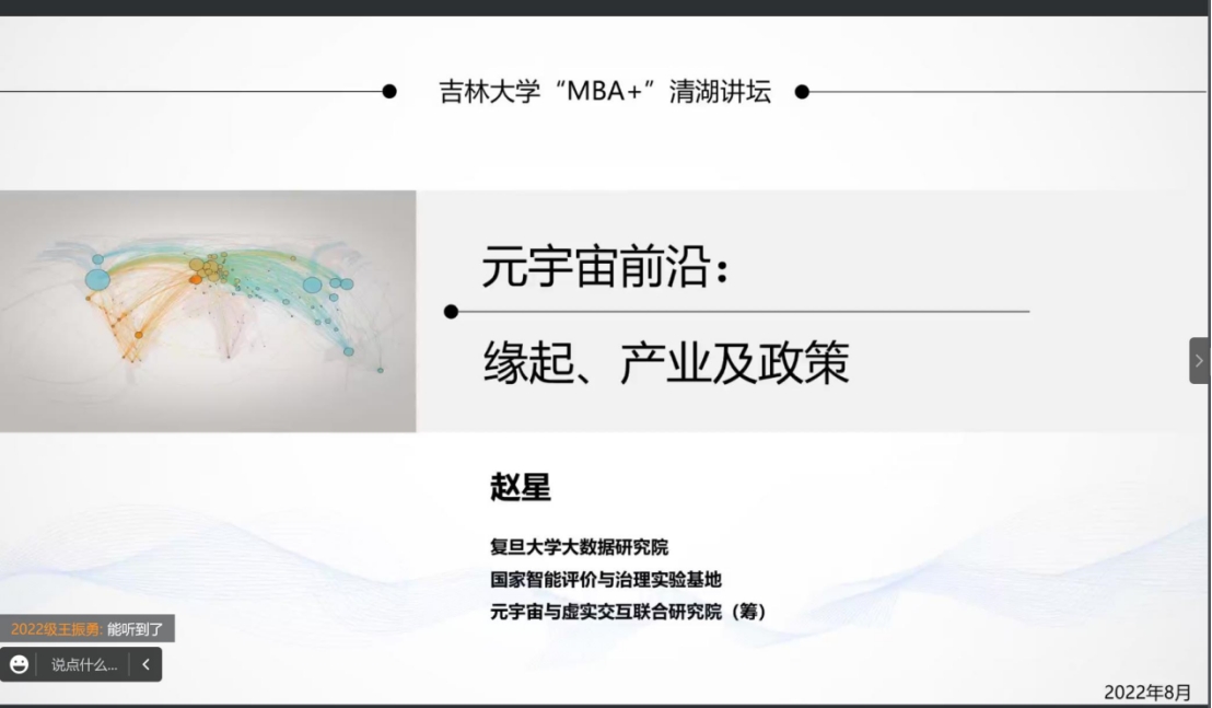 8月14日晚,清湖讲坛第二讲如期在云端举办。中心邀请复旦大学大数据研究院博士生导师赵星教授做题为《元宇宙前沿:缘起、产业与中国模式》专题讲座。本次活动由MBA教育中心主任兼365英国上市公司副经理张公一主持。365英国上市公司张卫东教授、郭宇副教授、中心教学管理办公室全体工作人员参加活动,MBA师生近600人在线收看。