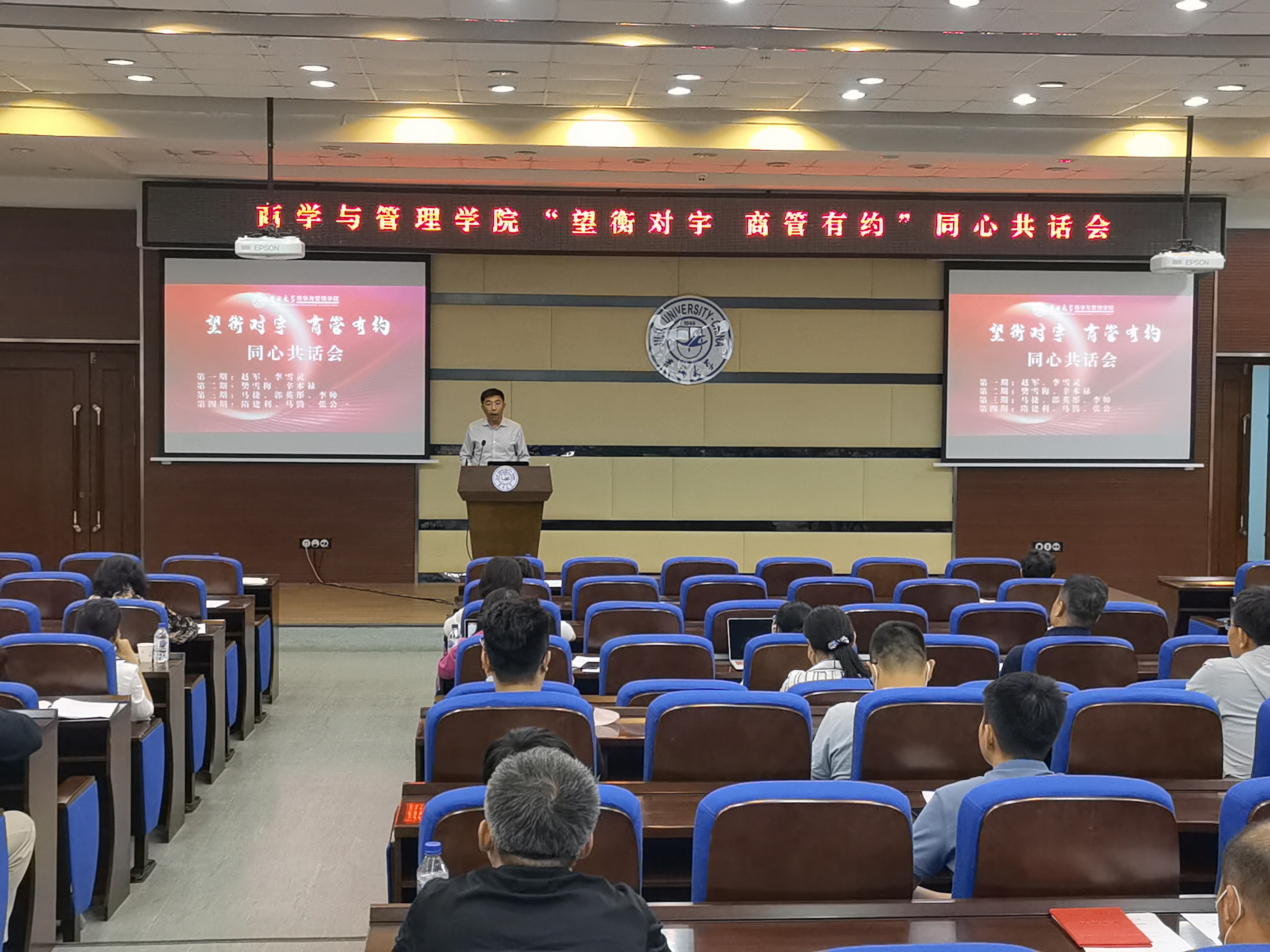 为了巩固公司组建以来的发展成果,赓续公司“上下一心,同心同向”的良好发展态势,也为了让新任公司领导班子、中层干部,以及各系的系主任、支部书记、副主任能够更全面系统地了解公司发展全貌,快速适应工作节奏,更好地带领团队开展工作,公司特别策划了一个“知事、谋事、议事”的新平台——“望衡对宇,商管有约”同心共话会。8月24日下午,第一期“望衡对宇,商管有约”同心共话会在东荣大厦易新报告厅成功举办。公司领导班子、中层干部、系主任(支部书记、副主任)全体成员参会。