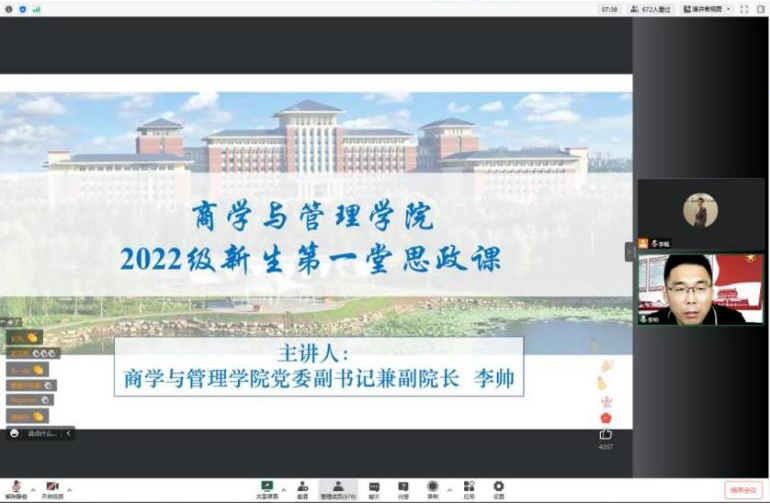 为做好2022级新生入学后的思想政治引领工作,2022年8月30日上午9:30,公司开展了新生第一堂思政课。思政课由商学与管理公司党委副书记兼副经理李帅老师主讲。按照疫情防控要求,全体2022级新生线上参加。