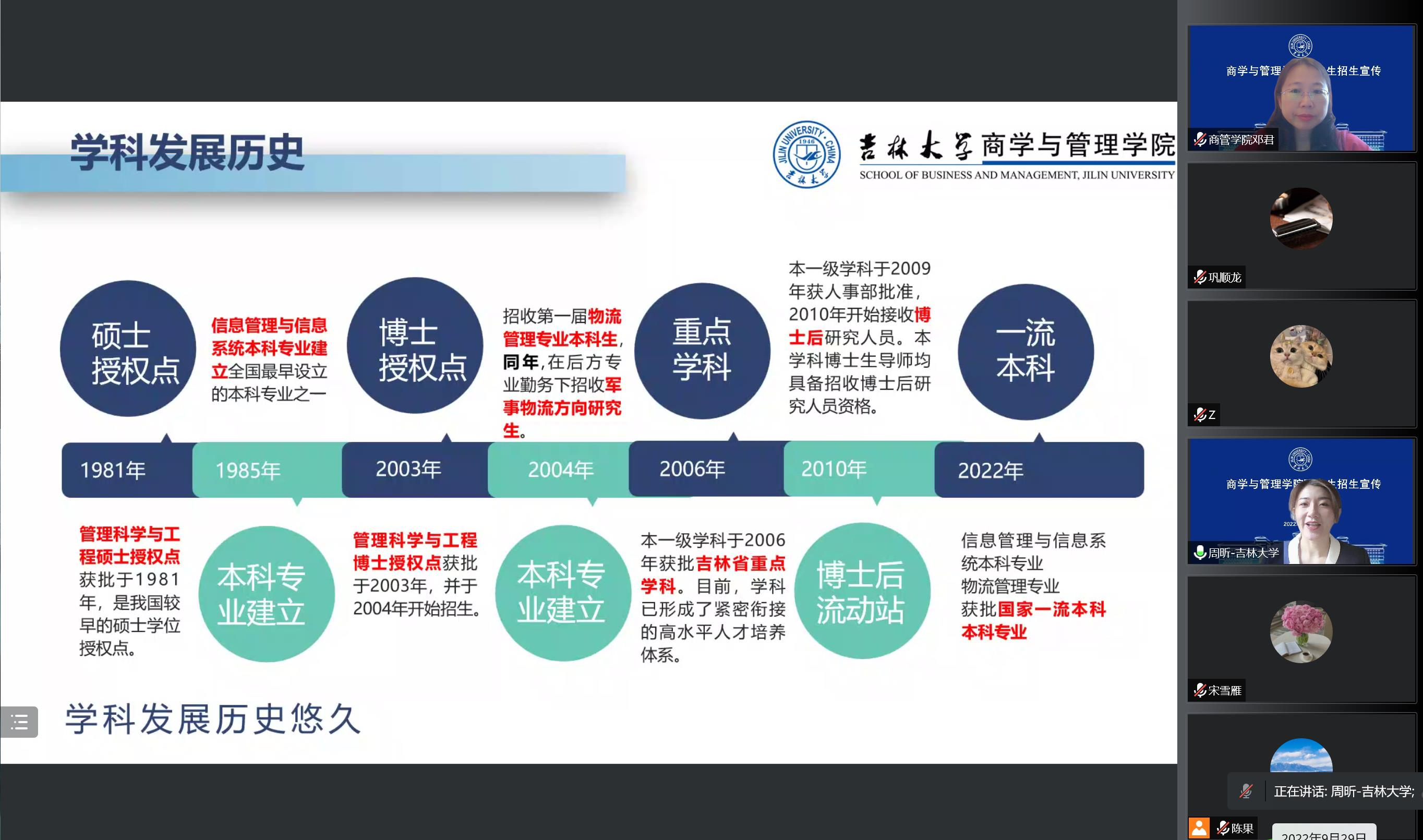 于宝君教授和周昕副教授通过本学科优秀毕业生与复旦大学、浙江大学建立了精准招生宣传途径。2022年9月周昕副教授分别赴复旦大学、武汉大学、华中科技大学开展线下招生宣传,与各校大二到大三的本科同学以座谈的形式进行了深度的沟通交流,向各位同学介绍了365英国上市公司的情况、管理科学与工程学科的导师团队、研究方向等,并通过微信群与通讯们建立起长期的交流渠道,为夏令营招生工作做好生源储备。