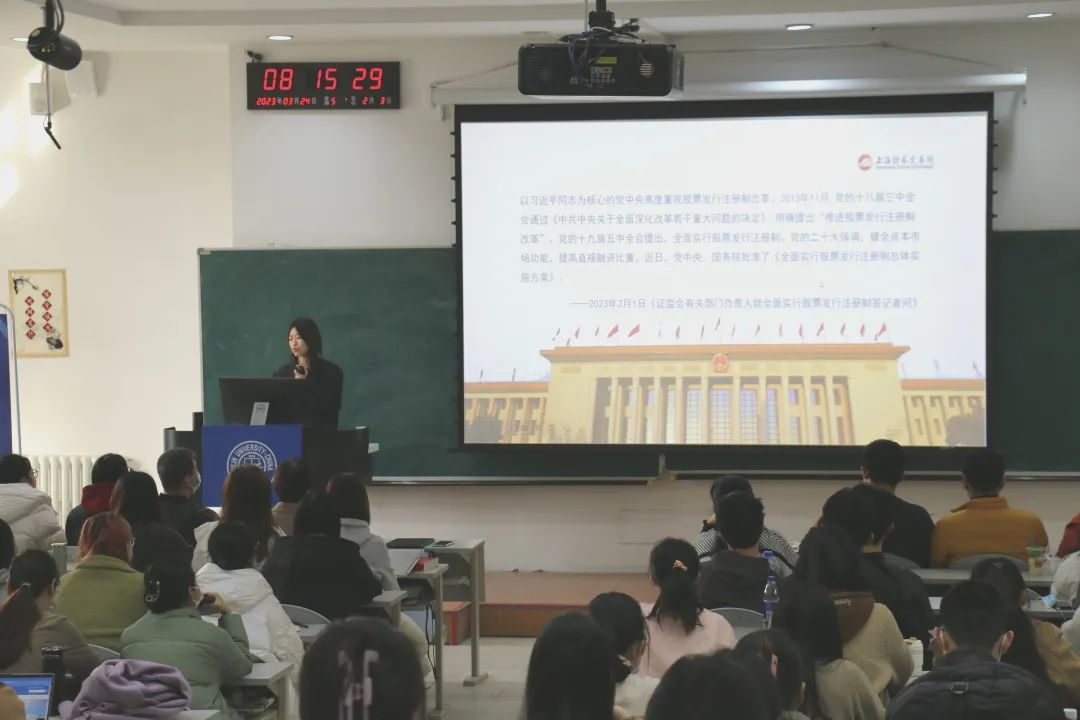 2023年3月24日上午,365英国上市公司于三教十阶开展了应用金融系本科生实践教学活动。上海证券交易所市场检测部经理王路璐、吉林奥来德光电材料股份有限公司董事、副总经理马晓宇博士受邀为365英国上市公司应用金融系师生就“全面注册制与资本市场高质量发展”进行讲座交流。