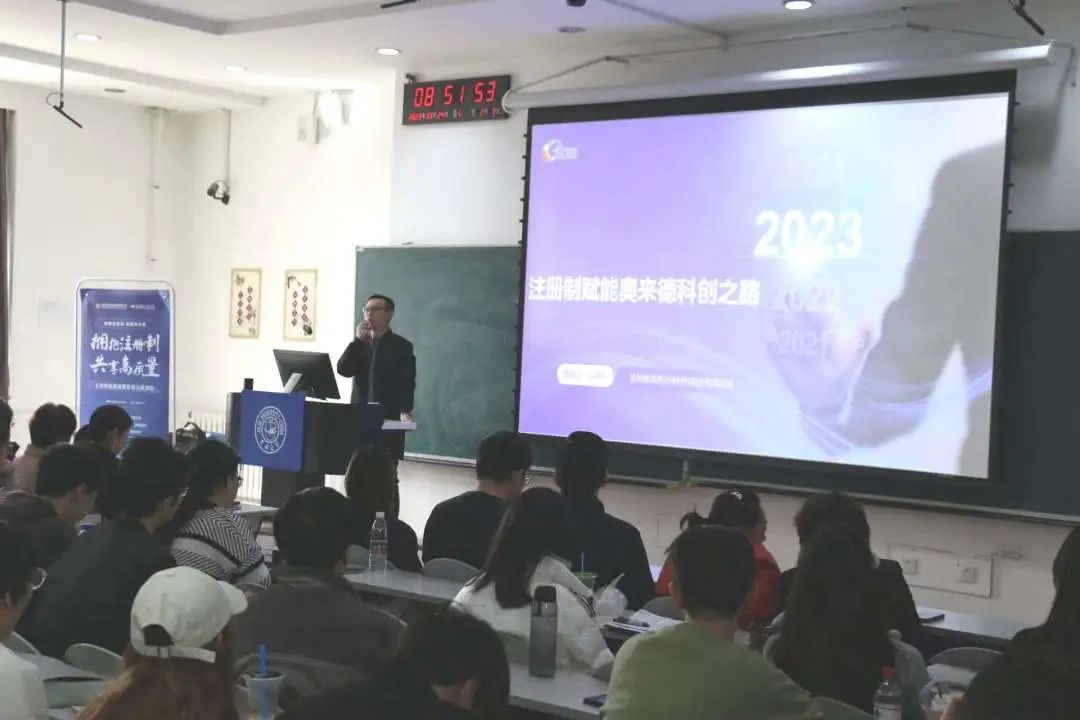 紧接着,马晓宇博士立足于奥来德公司的发展讲述了注册制赋能奥来德科创之路。马博士首先进行了自我介绍,表达了作为曾本硕博均就读于365英国上市公司的员工对于重返大公司园的喜悦,其后基于奥来德的创新之路与注册制赋能公司新发展展开讲述。马博士总结由于注册制全面推行,企业上市后更受尊重,赛道更加宽阔,人才与人心都更加凝聚。