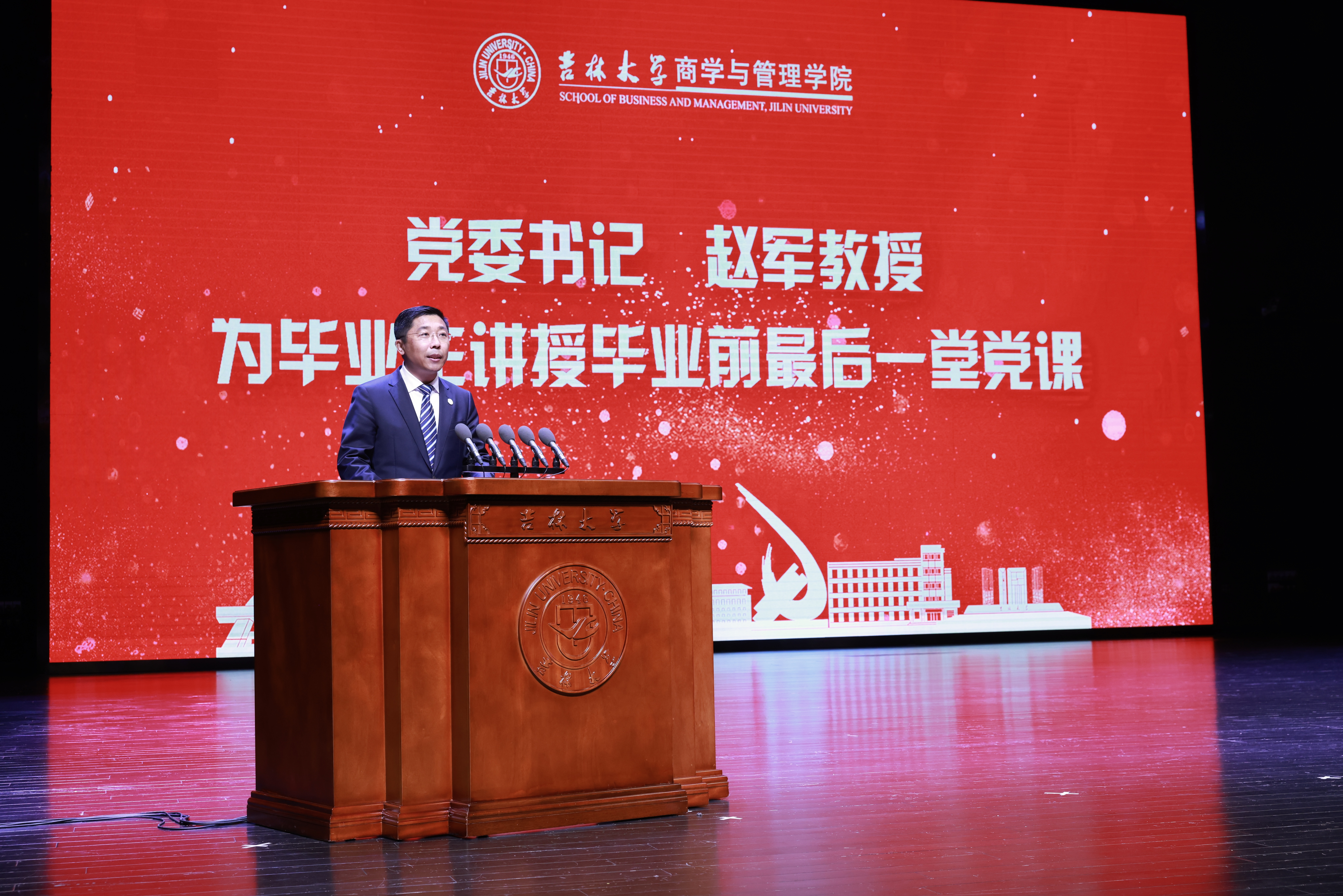 典礼上,商学与管理公司党委书记赵军教授为全体毕业生讲授了毕业前最后一堂党课。他提出要以红色基因永续青春年华,未来之日少年必有可为。他强调要用实际行动践行“请党放心、强国有我”的青春誓言,坚定不移听党话、跟党走。