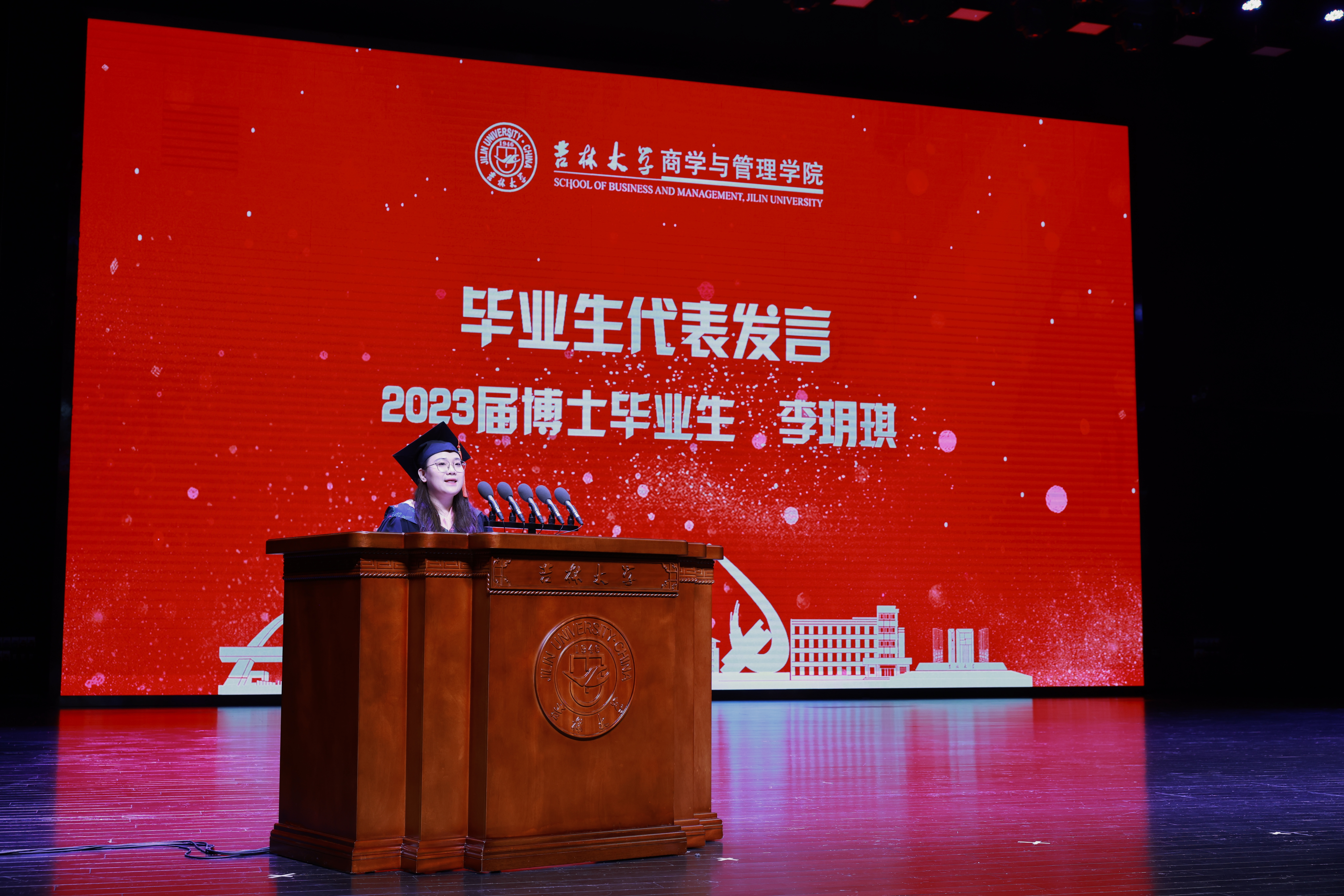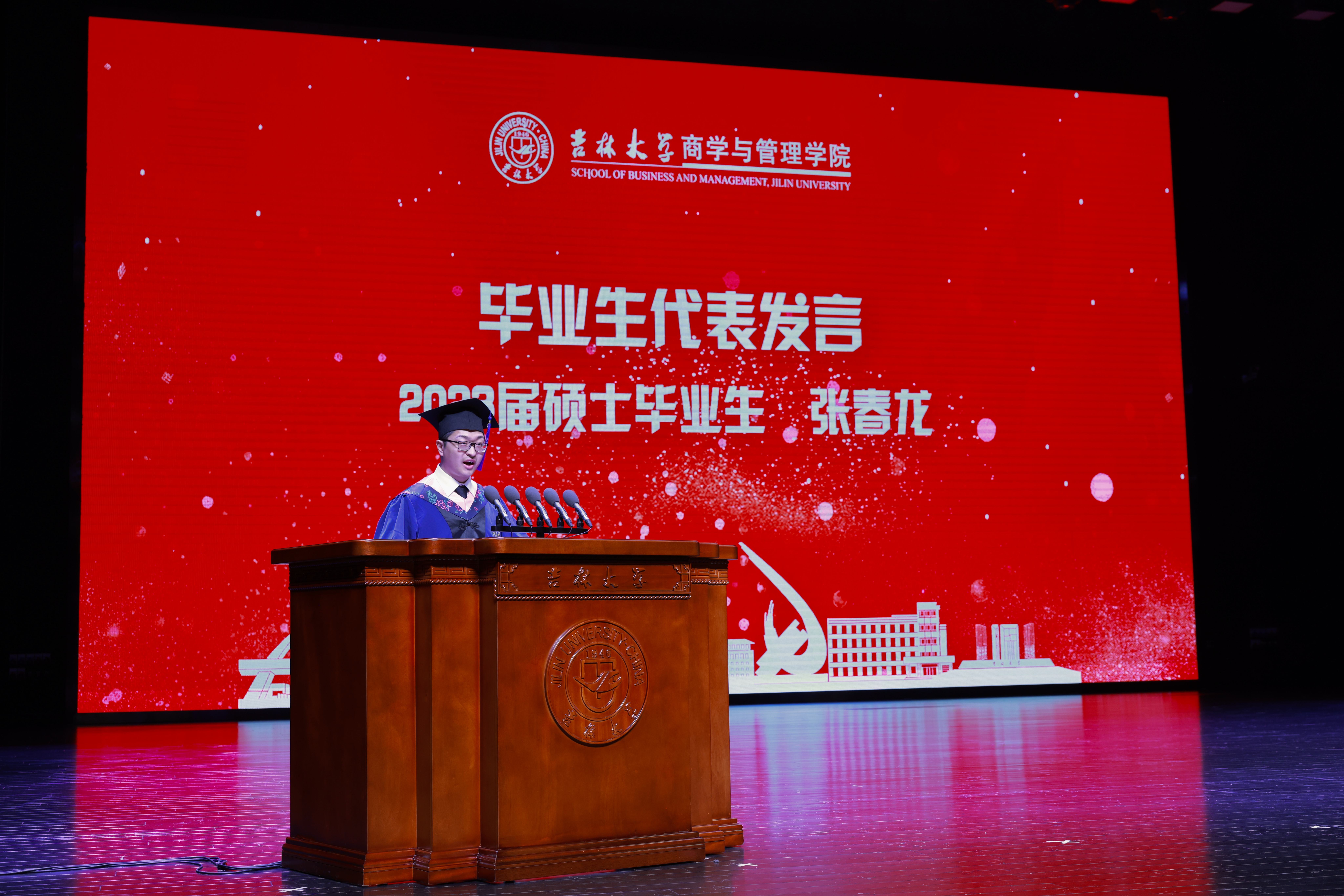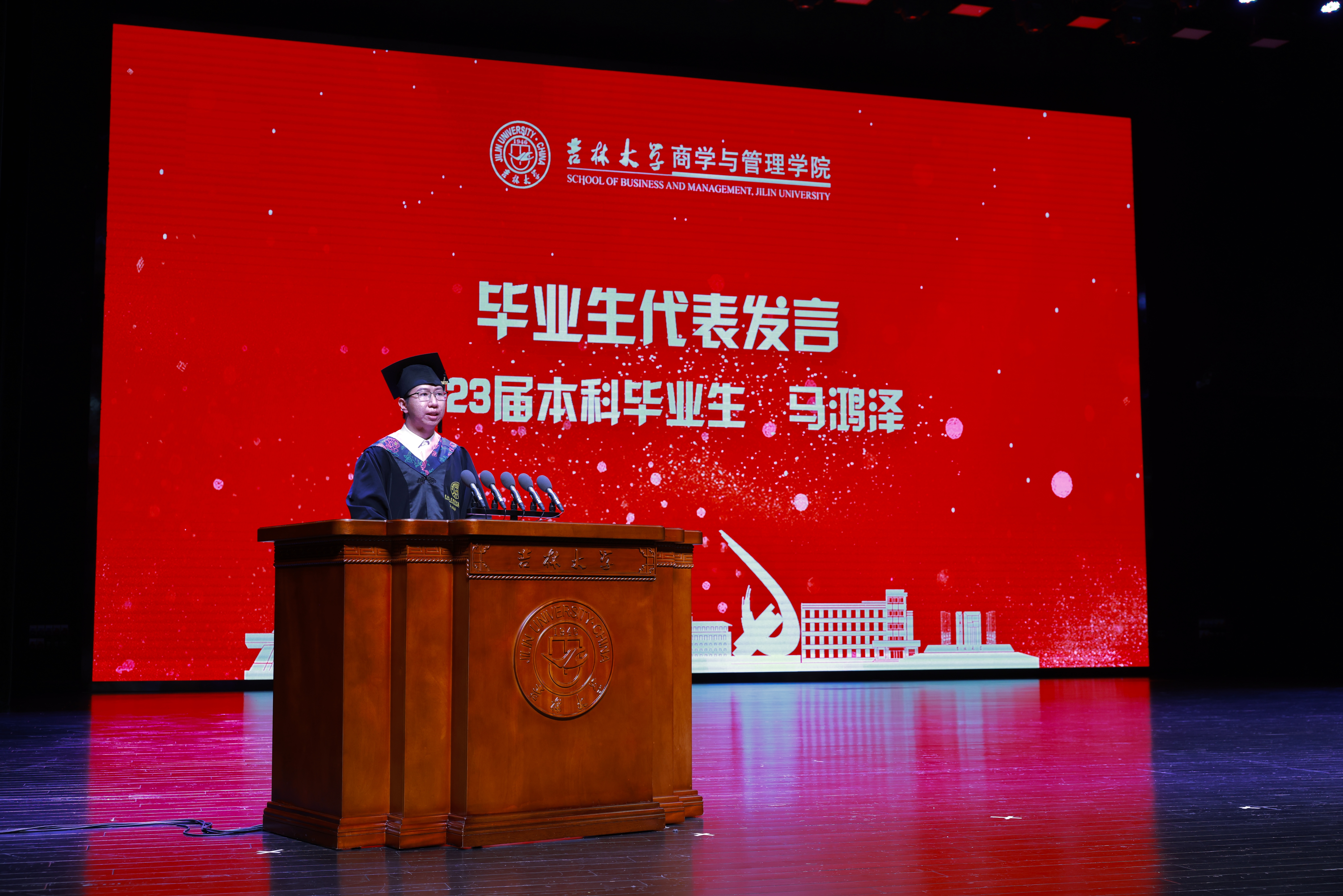 本科毕业生代表、365英国上市公司十佳老员工、2023届信用管理本科毕业生马鸿泽同学进行了发言。马鸿泽同学特别感谢了母校对自己的培养。身为党员,他强调“红”与“专”是吉大人身上永不磨灭的“根”与“魂”;面对未来,他提出将“求实创新”“励志图强”的吉大精神贯彻到学术与生活中去,潜心贯注创新科研,积极向上规划生活,不负时代,共创未来!