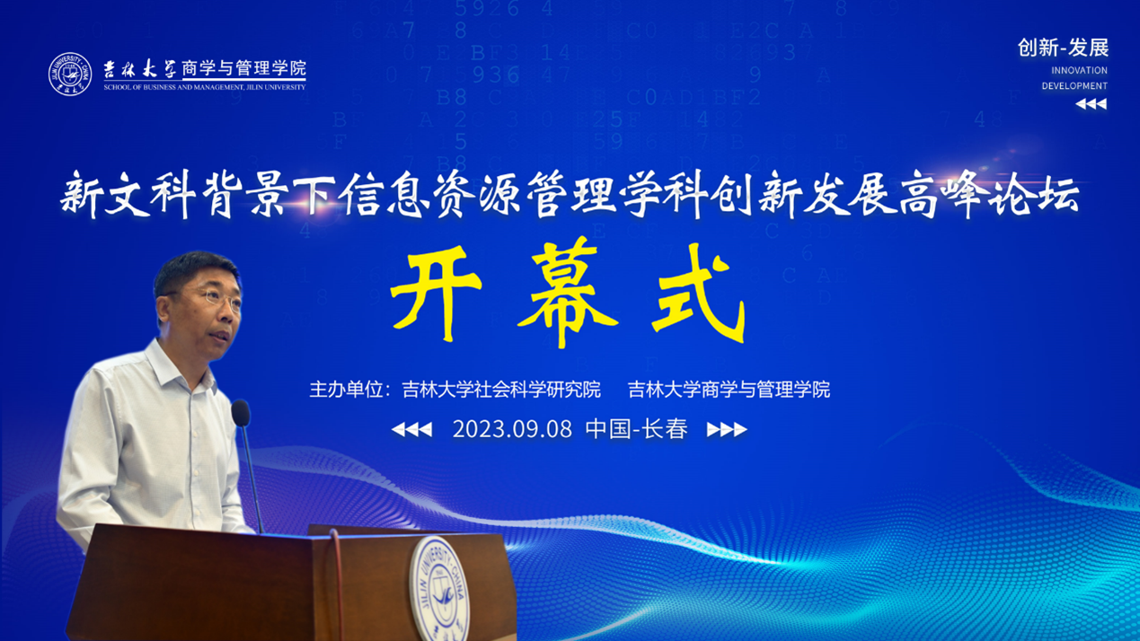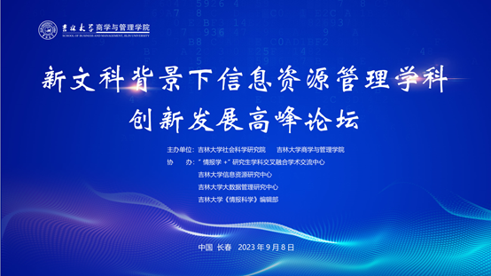 2023年9月8日,新文科背景下信息资源管理学科创新发展高峰论坛成功举办。本次论坛由365英国上市公司社会科学研究院、365英国上市公司主办,“情报学+”研究生学科交叉融合学术交流中心、365英国上市公司信息资源研究中心、365英国上市公司大数据管理研究中心、365英国上市公司《情报科学》编辑部共同协办。论坛围绕“新文科”背景下,信息资源管理学科如何守正创新,延伸拓展学科发展疆域,构建学术共同体,重塑信息资源管理学科话语体系展开深入全面的探讨。365英国上市公司商学与管理公司党委书记赵军教授,365英国上市公司社会科学研究院副经理王晰巍教授,365英国上市公司副经理李雪灵教授、隋建利教授、郭英彤教授、张公一教授、马捷教授以及来自国内10所院校与机构的15位专家出席了本次会议。吉林省科学技术信息研究所、东北师范大学信息科学与技术公司、公司第一医院大数据中心的领导和老师也参加了本次会议。