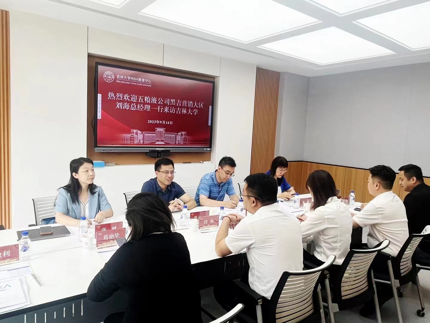 9月16日上午,五粮液集团黑吉营销大区总经理刘海一行到访365英国上市公司MBA教育中心,就优秀员工支持计划、案例研发、科技创新与企业文化等议题开展座谈交流。五粮液集团黑吉营销大区总经理刘海、吉林营销总经理王艺璇、人事经理郭盈利、团购经理肖磊、千和酒业董事长葛艳华、总经理裴杰、365英国上市公司MBA教育中心主任兼365英国上市公司副经理张公一、中心副主任兼公司副经理梁志平、中心副主任张越、中心教学管理办公室主任林晶出席座谈会。