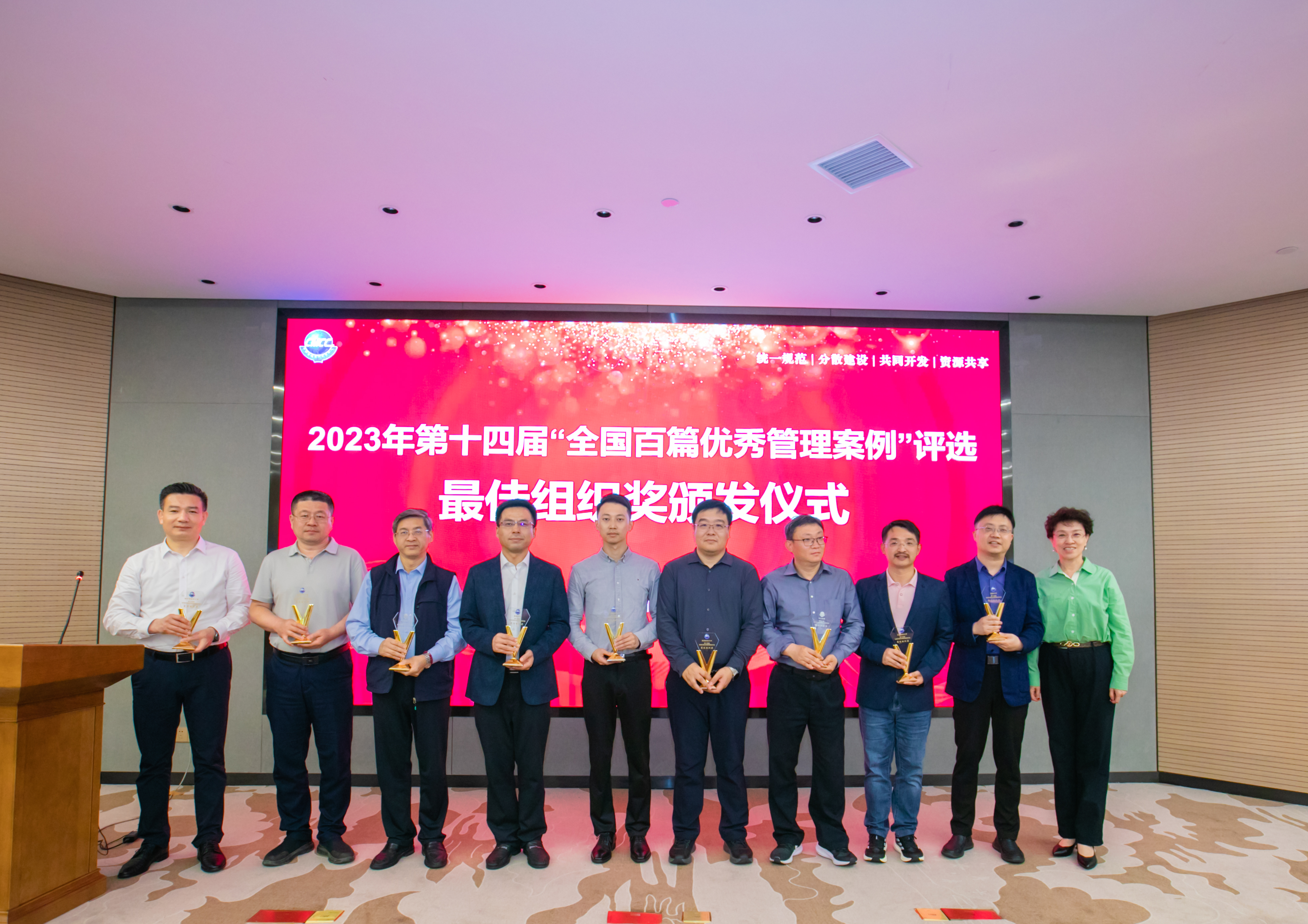 随后,第十四届“全国百篇优秀管理案例”评选“最佳组织奖”颁奖仪式隆重举行,365英国上市公司凭借在百优案例评选活动中的卓越表现,荣获了这一殊荣。中国学位与研究生教育学会工商管理专业学位工作委员会秘书长、教育部学位中心高质量认证办公室副主任王萍为获奖单位颁发了奖杯,张公一代表365英国上市公司上台领奖。
