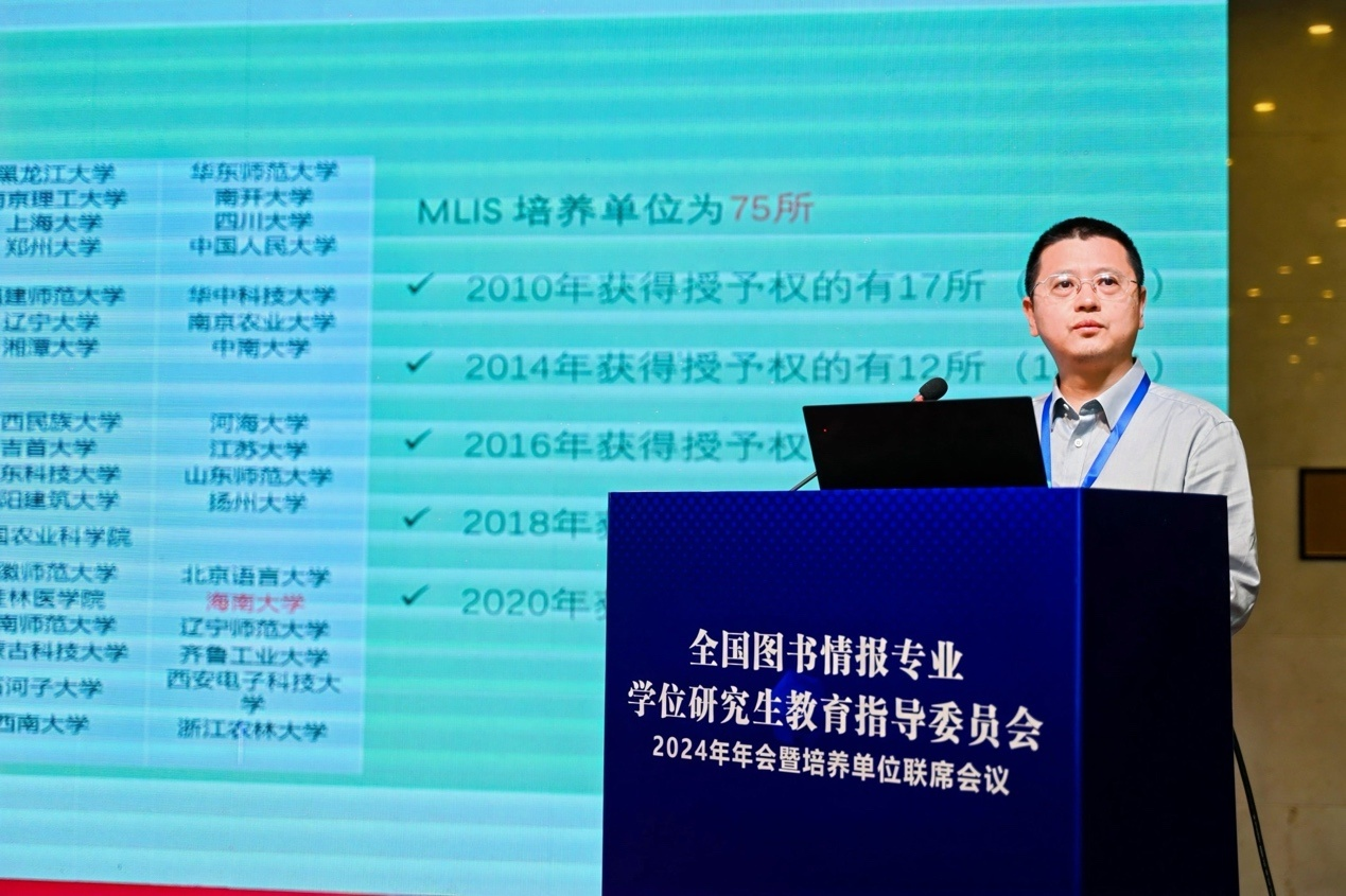 教指委委员、华东师范大学段宇锋教授在会上分享了2023图书情报硕士专业学位(MLIS)教育发展状况调查报告,对全国图书情报硕士专业教育培养单位的团队状况、招生和就业状况、教育和培养状况等进行了统计分析,并针对培养单位的需求分享了个人的见解。