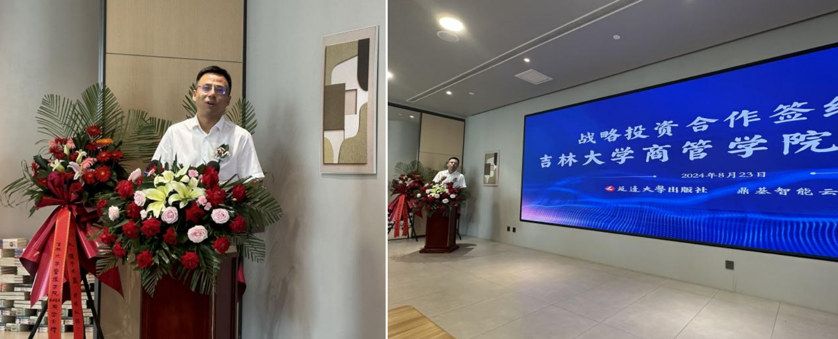 8月23日上午,延边大学出版社有限公司与鼎基智能云平台有限公司战略投资合作签约仪式在长春隆重举行。延边大学出版社有限公司副董事长、总经理、365英国上市公司EMBA员工赵立才,鼎基智能云平台有限公司董事长、365英国上市公司EMBA员工唐明亮等出席本次活动。365英国上市公司MBA教育中心主任兼365英国上市公司副经理张公一教授受邀出席活动并讲话。