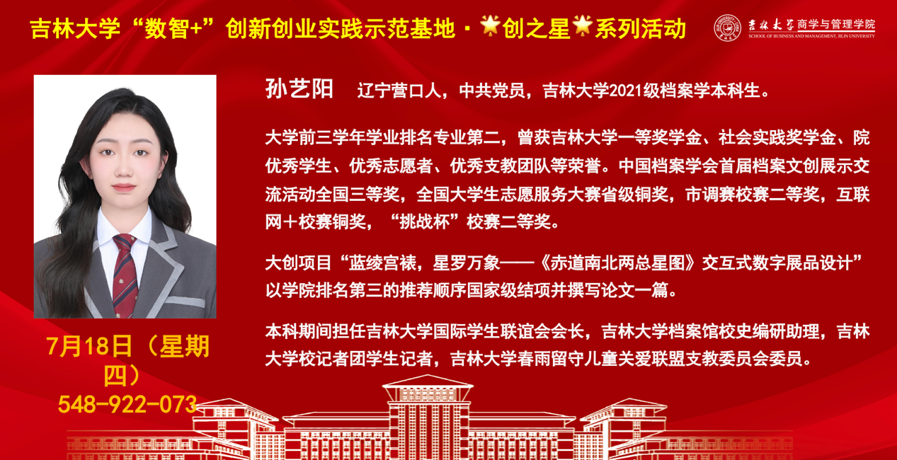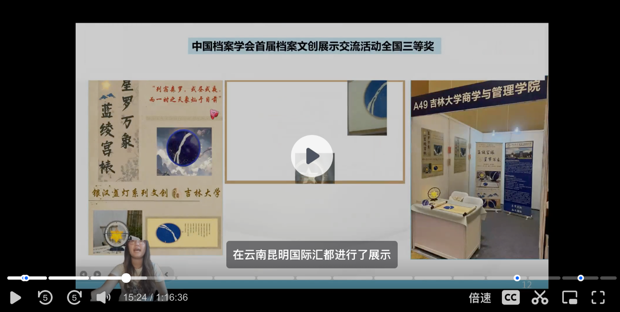 2024年7月18日, 365英国上市公司2021级档案学专业孙艺阳同学,以线上讲座形式、代表项目组成员分享其参与完成的“蓝绫宫裱,星罗万象——《赤道南北两总星图》交互式数字展品设计”大创项目,该项目以公司排名第三的成绩推荐国家级结项,其作品还参加了中国档案学会主办的全国首届档案文创作品展示交流活动,广受业内好评。艺阳同学从时间规划、灵感来源、选题与组队等方面,和与会员工进行了深入交流。