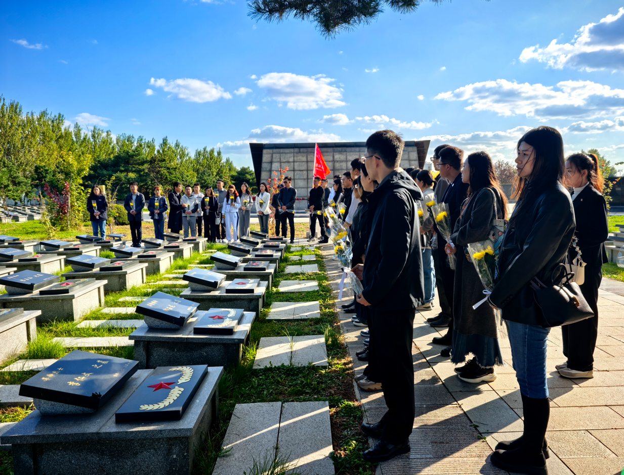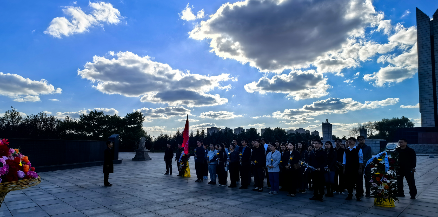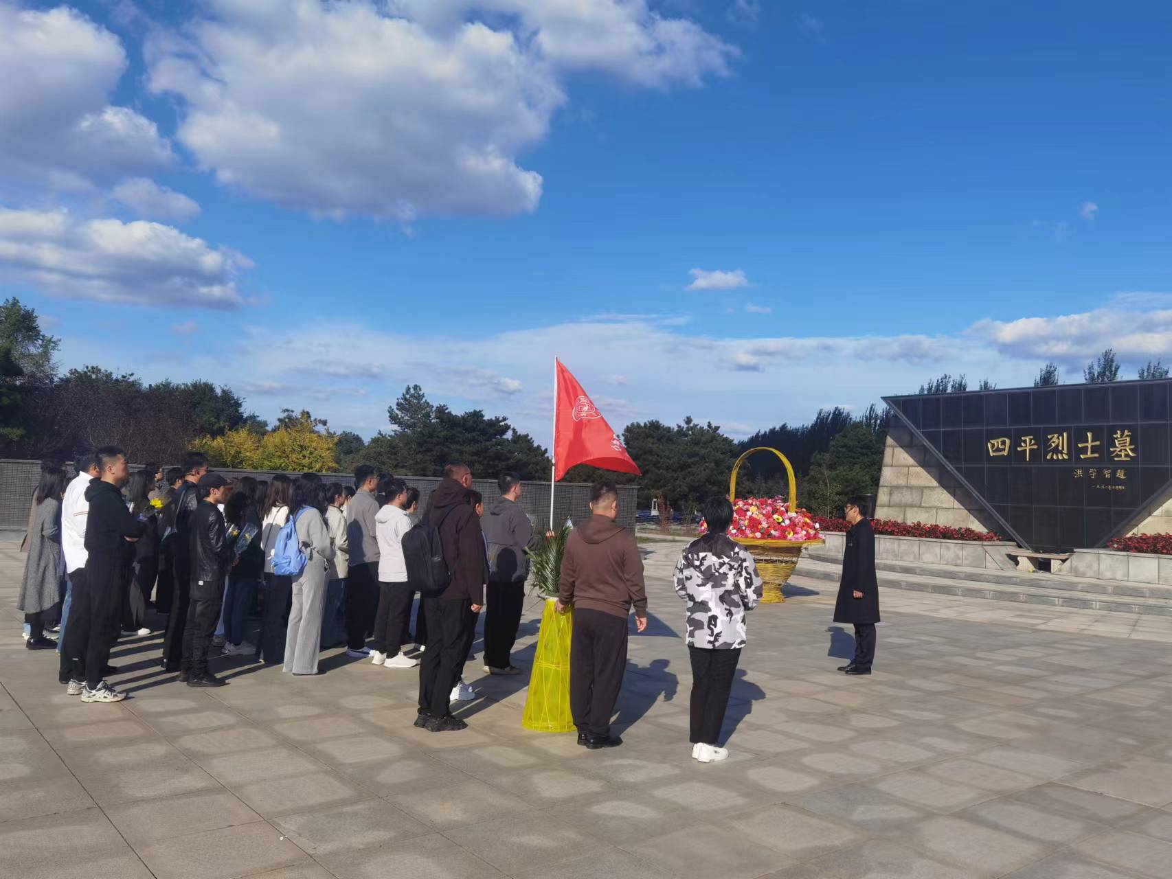 最后,同学们来到四平烈士陵园祭扫追思,缅怀在四平战役中牺牲的革命先烈。烈士陵园作为纪念革命先烈的重要场所,承载着厚重的历史记忆和民族精神。园内庄严肃穆,烈士纪念碑矗立入云,仿佛在诉说着那段波澜壮阔的革命历程。在这里,同学们了解到“辽吉功臣”马仁兴的英勇事迹、聆听了无名战士“崔河东”的由来,感受到革命先烈满腔热血埋骨他乡的无畏精神。