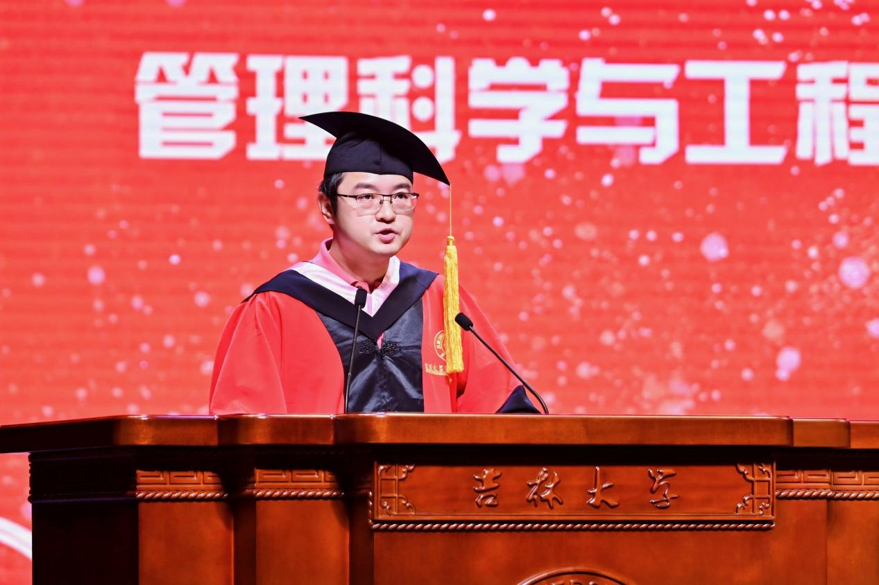 典礼上,教师代表、管理科学与工程系于宝君教授送上临别箴言,以贴近员工实际学习生活的诙谐幽默又充满智慧的语言,寄语毕业生在远行的道路上,要始终秉持真理与良知,用专业做事,以信念做人。