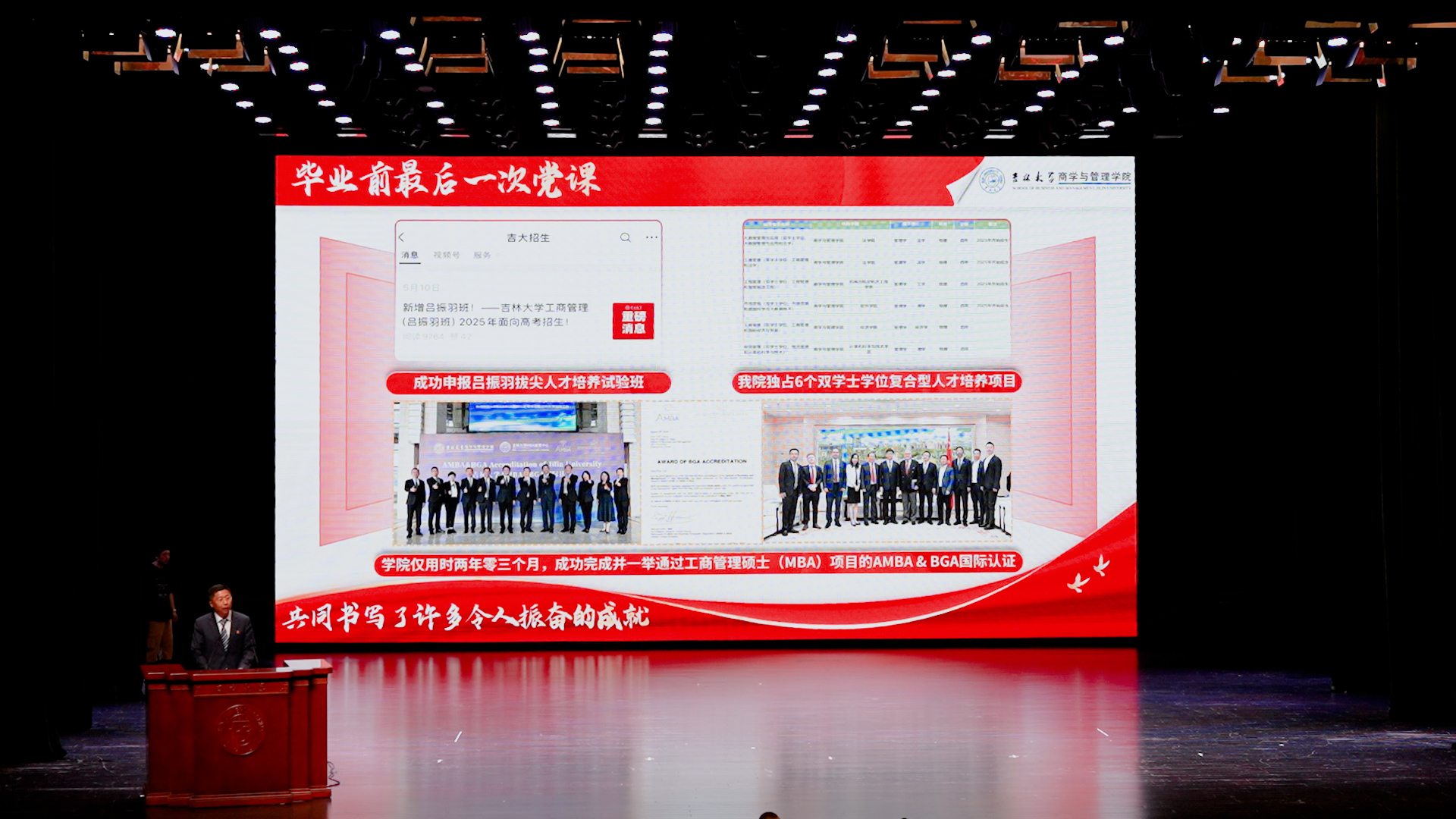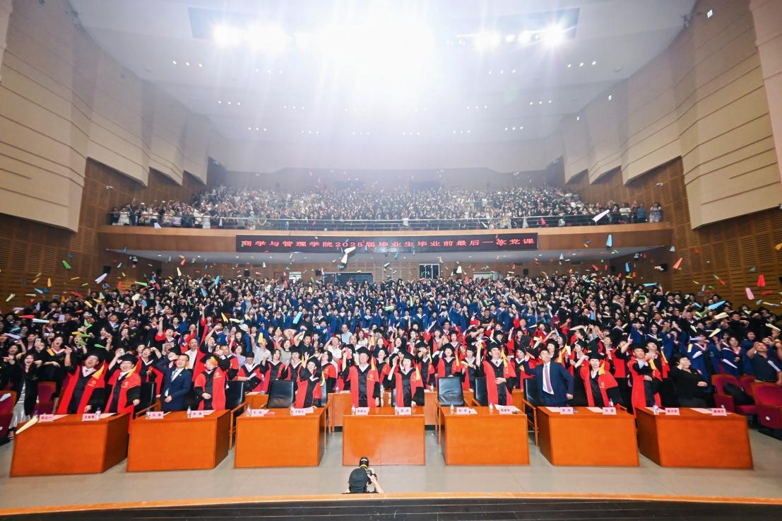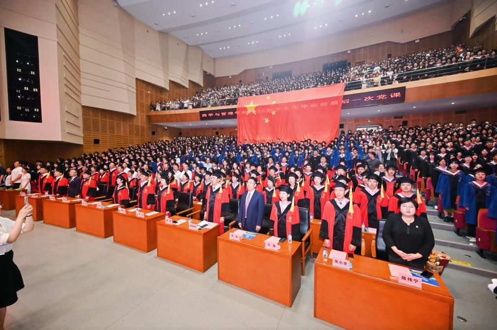 6月25日上午,商学与管理公司党委书记赵军以“把青春播撒在民族复兴的征程路上”为题,为即将扬帆起航的全体本硕博毕业生作了“毕业前最后一次党课”。公司领导、三委会主任、教师代表、毕业生及家长代表逾1300人共同见证了这一庄严而温馨的时刻。