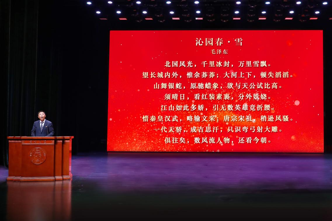 党课上,赵军带领全体毕业生同学们共同朗诵毛泽东同志的壮丽诗篇《沁园春·雪》。随着朗诵声的响起,一面巨大的五星红旗在会场中央庄严展开。在恢弘的音乐和铿锵的诵读声中,“北国风光,千里冰封,万里雪飘”的磅礴气势扑面而来,“江山如此多娇,引无数英雄竞折腰”的历史画卷徐徐展开。这面鲜艳的五星红旗与诗中描绘的壮美河山交相辉映,革命领袖的豪迈气概与家国情怀瞬间点燃了全场师生的爱国热情。朗诵至“数风流人物,还看今朝”时,现场气氛达到顶点,强烈地昭示着新时代青年继承先辈遗志、勇担复兴大任的历史自觉与坚定信念。 五星红旗的展开,不仅表达了后辈有志青年对波澜壮阔的革命历史的崇高致敬,更激励全体毕业生将个人理想融入为祖国山河添彩、为民族复兴建功的宏伟事业中。