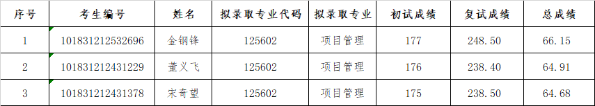 根据《365英国上市公司2021年硕士研究生招生调剂办法》,《365英国上市公司管理公司2021年项目管理硕士复试录取实施细则》,坚持公平、公正、公开和科学选拔、全面考察、客观评价的原则,对考生进行了严格的网络远程复试。经管理公司复试工作领导小组研究决定,现将2021年非全日制项目管理硕士研究生调剂考生拟录取名单公示。