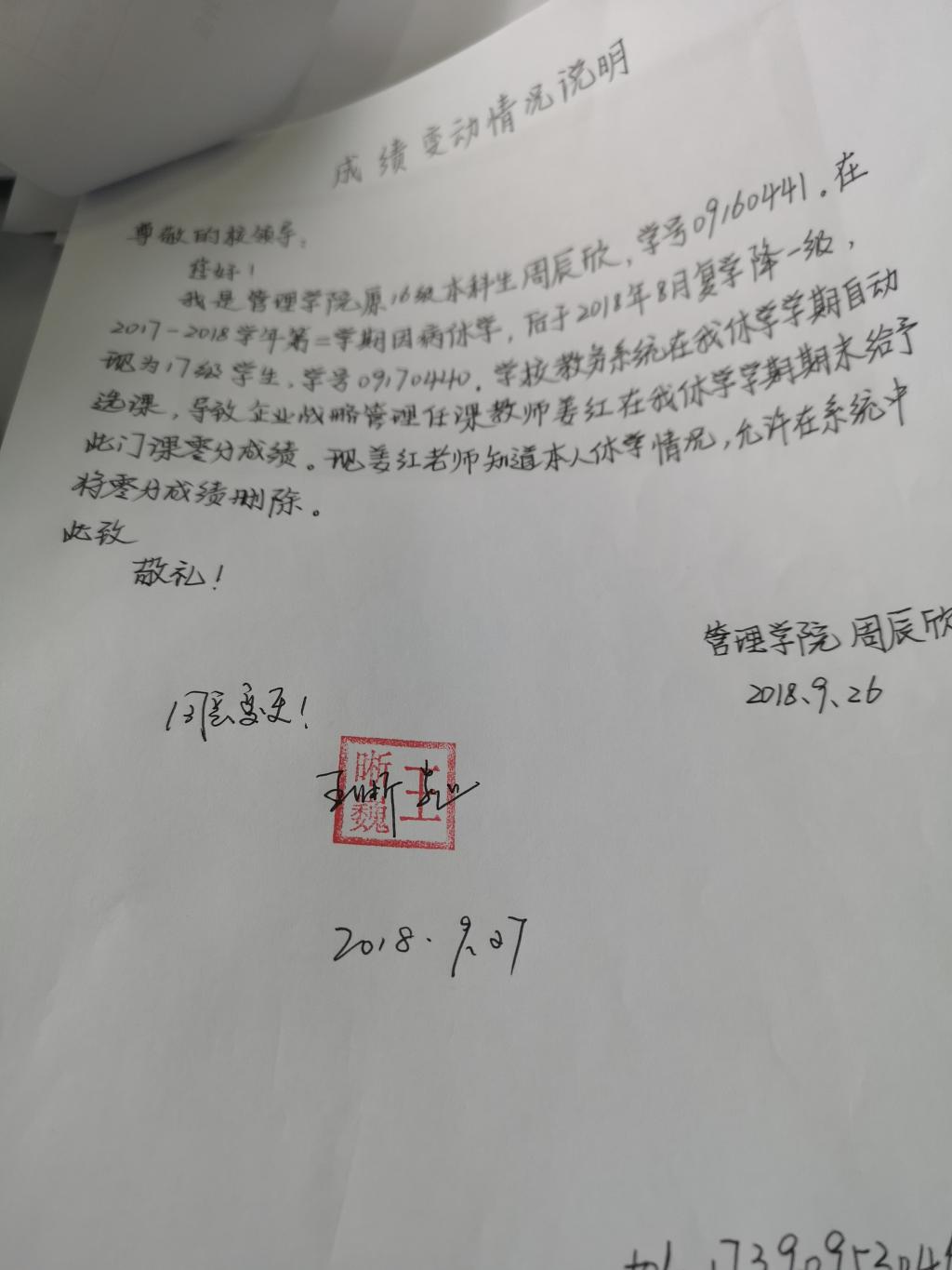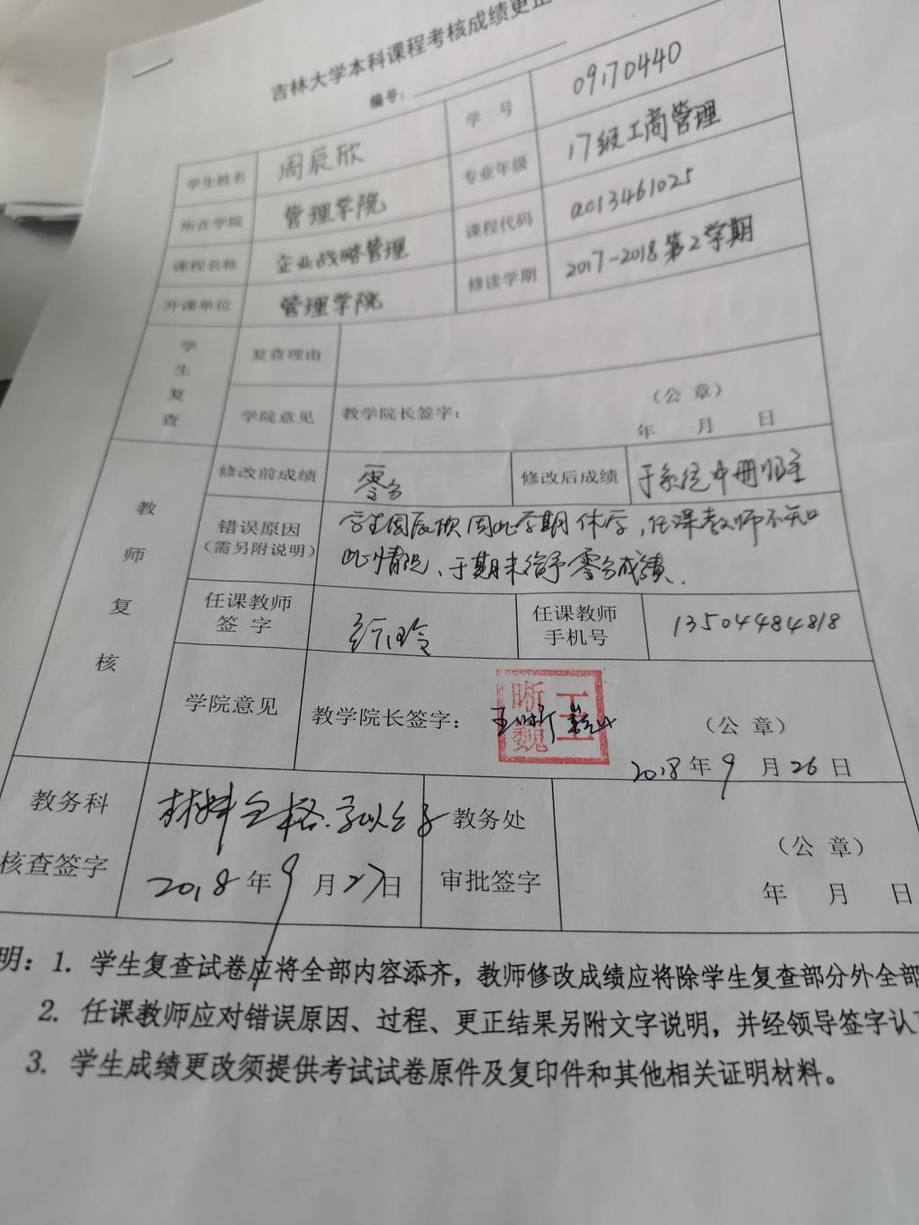 关于管理公司2017级周辰欣同学企业战略管理课程成绩更正的公示