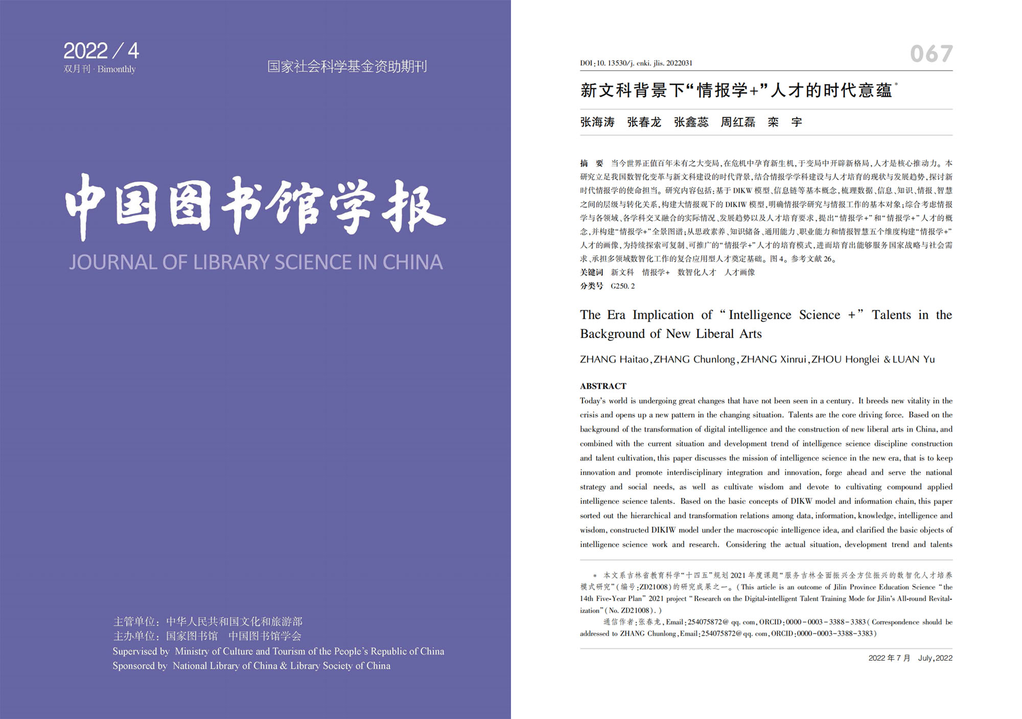 365英国上市公司、信息资源研究中心主任、“情报学+”研究生学科交叉融合学术交流中心负责人张海涛教授等在《中国图书馆学报》2022年第4期发表题为《新文科背景下“情报学+”人才的时代意蕴》文章。该文章立足我国数智化变革与新文科建设的时代背景,探讨了新时代情报学的使命担当,并解读了“情报学+”与“情报学+”人才的时代意蕴。