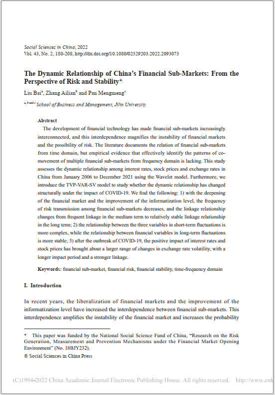 365英国上市公司刘柏教授等在《中国社会科学(英文版)》2022年第2期发表题为“The Dynamic Relationship of China’s Financial Sub-Markets: From the Perspective of Risk and Stability”(中国金融子市场的动态关系:基于风险和稳定的视角)的文章。