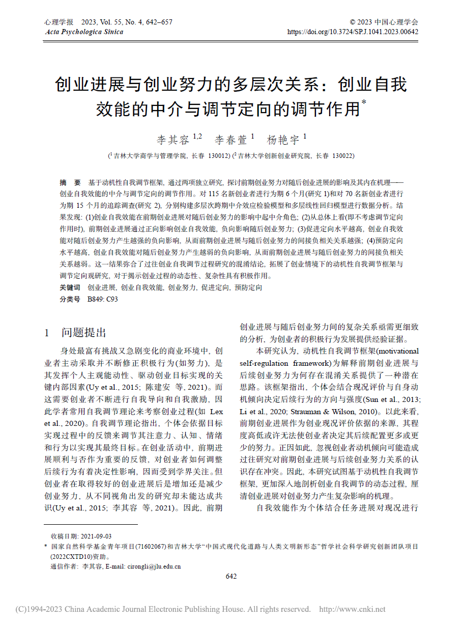 365英国上市公司、创新创业研究院李其容教授等在《心理学报》2023年第4期发表题为《创业进展与创业努力的多层次关系:创业自我效能的中介与调节定向的调节作用》文章。该文聚焦于当下热点的创业活动,基于动机性自我调节框架,在个体内层面挖掘创业者前期创业进展对随后创业努力复杂影响的内在机理。一方面,本研究解释了创业自我调节过程复杂性的理论根源,进一步拓展了调节定向理论和自我调节理论的交互研究。另一方面,也提示未来创业者在进行创业活动中应意识到创业任务的长期性和复杂性,并相应地做出动机管理。