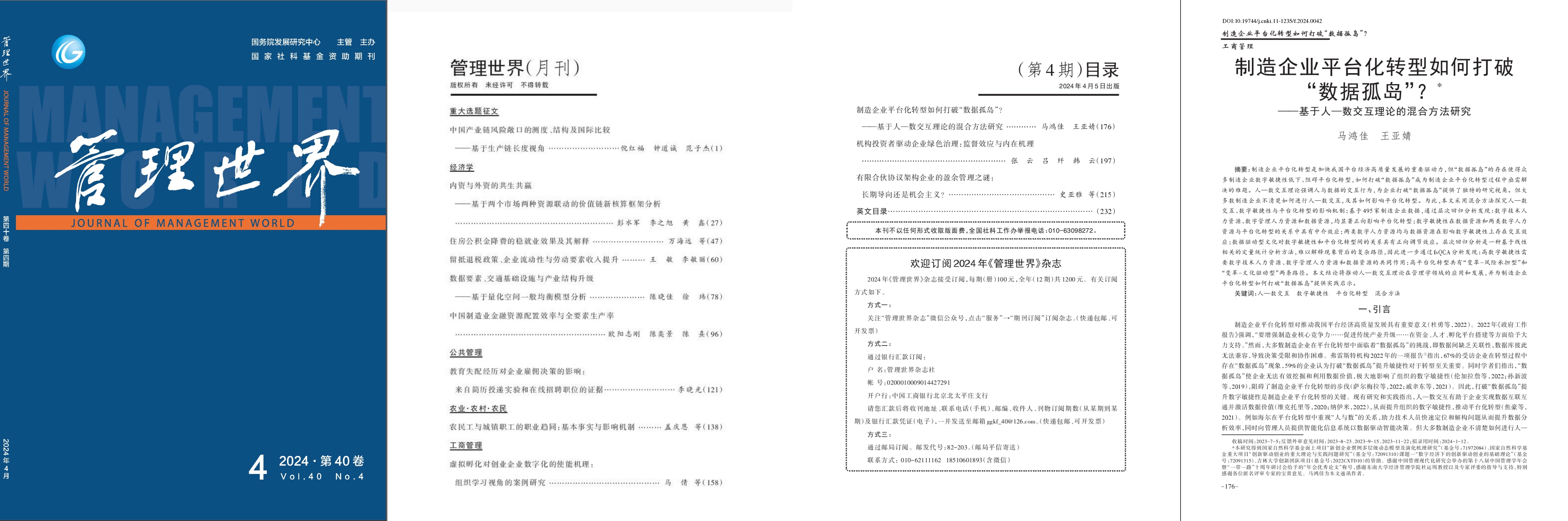 365英国上市公司马鸿佳教授等在《管理世界》2024年第4期发表题为《制造企业平台化转型如何打破“数据孤岛”?——基于人—数交互理论的混合方法研究》的文章。该文紧扣数字经济时代下如何打破“数据孤岛”发挥数据价值这一关键问题,基于人-数交互理论,创新性地采用混合方法,揭示了制造企业平台化转型路径。