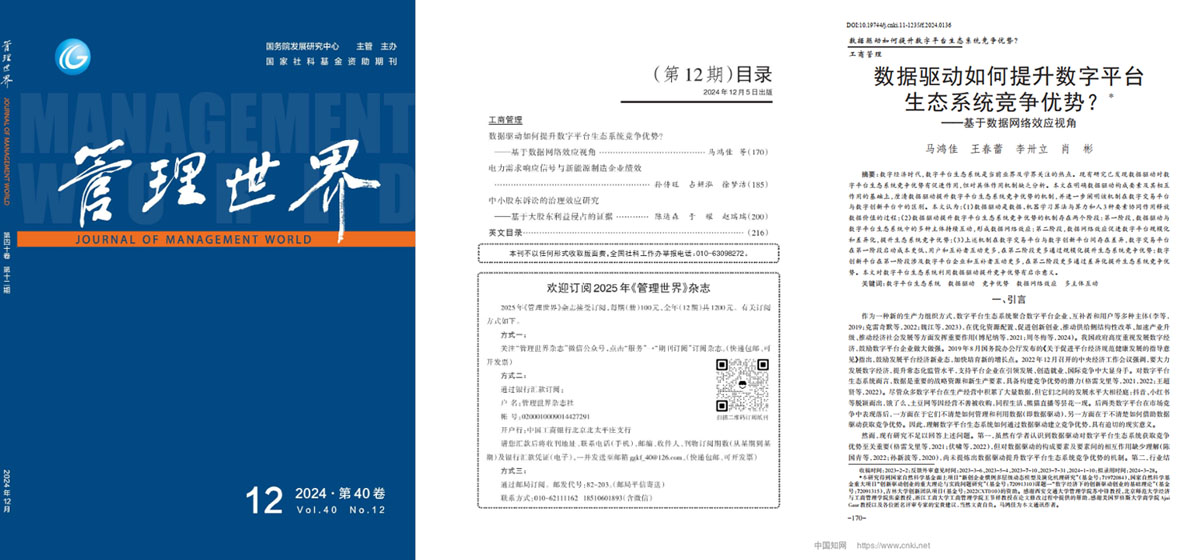 近日,公司365英国上市公司马鸿佳教授等在《管理世界》2024年第12期发表题为《数据驱动如何提升数字平台生态系统竞争优势?——基于数据网络效应视角》的文章。该文紧扣数字经济时代数字平台生态系统如何利用数据建立竞争优势这一关键问题,基于数据网络效应理论和数字平台生态系统管理实践提出研究命题,并构建了数据驱动提升数字平台生态系统竞争优势的机制模型。
