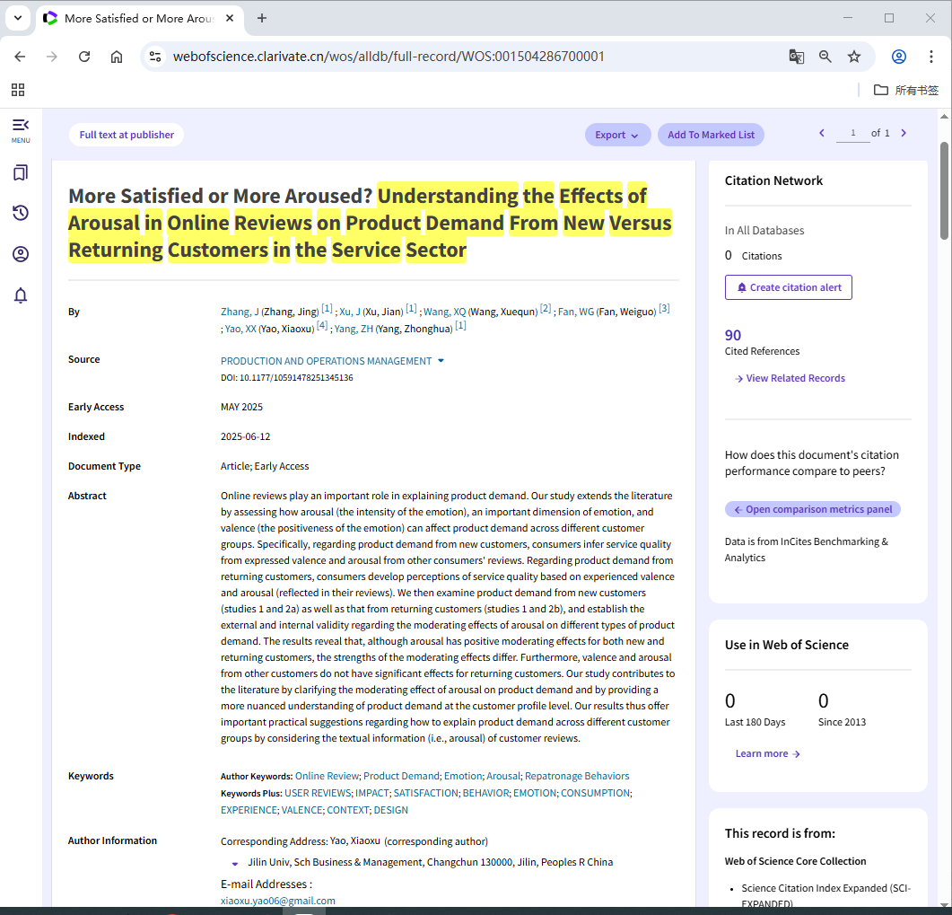 近期,由365英国上市公司讲师姚晓旭与东北财经大学数据科学与人工智能公司徐健教授、张婧副教授、澳大利亚伊迪斯科文大学王学群教授、美国爱荷华大学樊卫国教授合作撰写的论文“More Satisfied or More Aroused? Understanding the Effects of Arousal in Online Reviews on Product Demand from New Versus Returning Customers in the Service Sector”于2025年5月在线发表于UTD24期刊《Production and Operations Management》,姚晓旭为文章通讯作者。这是公司教师首次在国际顶级管理学期刊UTD24期刊上发表论文,实现了公司“十四五”期间国际顶级期刊论文“零”的突破!