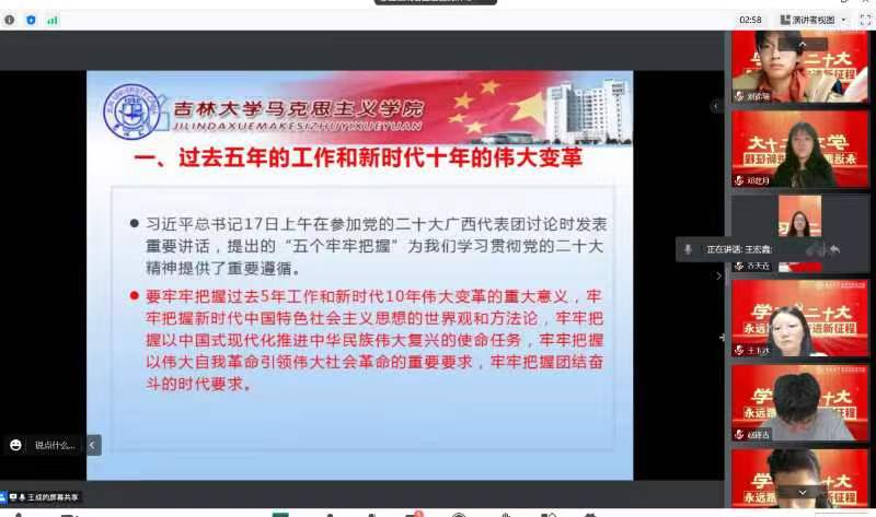 为扎实落实公司党委关于学习宣传贯彻二十大精神的工作部署,深刻领会二十大报告的思想、内涵、部署、要求,切实把思想和行动统一到党的二十大精神上来,党委员工工作部统一部署、精心策划,于2022年10月29日线上召开党的二十大精神系列宣讲活动第一讲,由马克思主义公司教授王成老师担任主讲人,中心校区各公司本科生党员、预备党员、入党积极分子代表参加会议。