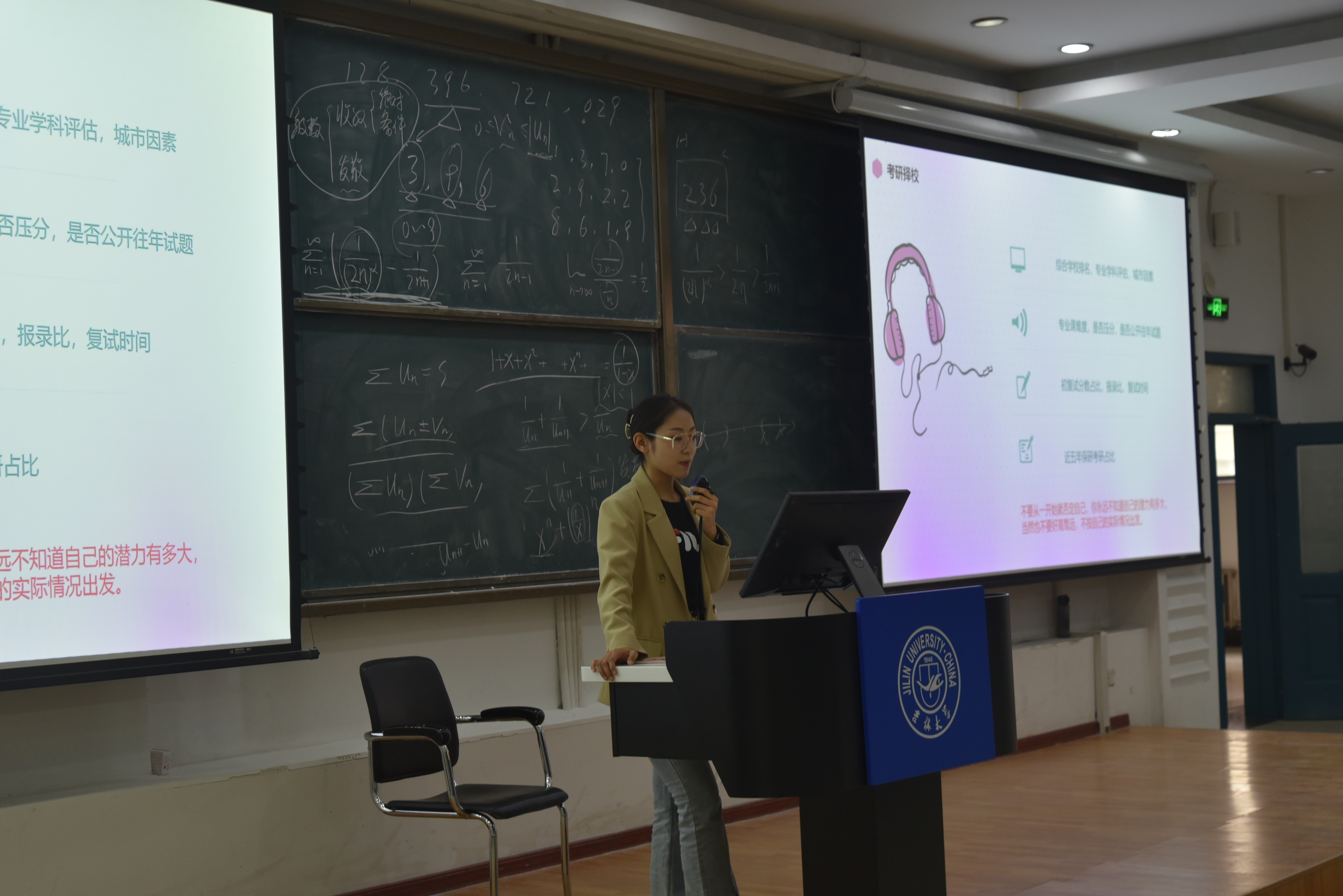 首先进行分享的是会计学的宋茗慧,学姐从自身背景、考前规划与准备和初始备考指南三个方向进行了介绍。宋茗慧学姐以自身亲身经历向大家传授了自己的备考心得,尤其在选校建议和落实考研计划两个方面多次强调,希望同学们提高重视程度。