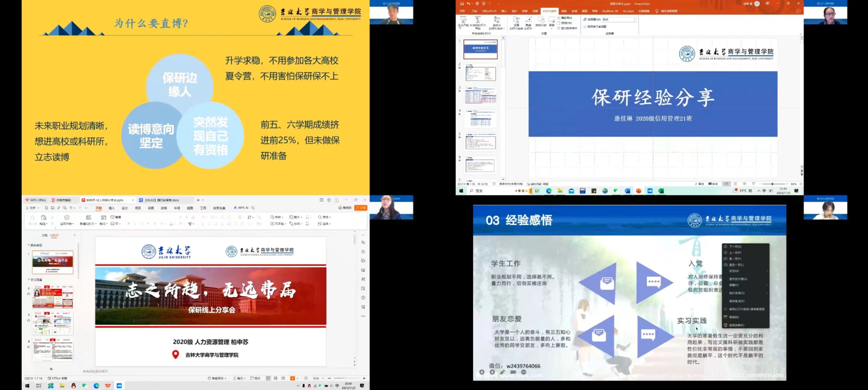 “百舸争流,奋楫者先”,为了响应公司和公司关于加强学风建设的部署要求,选树优秀员工典型,公司开展了第二期的经验分享会。本次分享会邀请了2020级优秀员工陈功坤、柏申苏、王宏鑫以及惠佳琳,四位同学结合自身保研、直博经历,从不同角度向参会同学们介绍如何能够在激烈的竞争中获得宝贵的录取名额,同时回答同学们疑问。