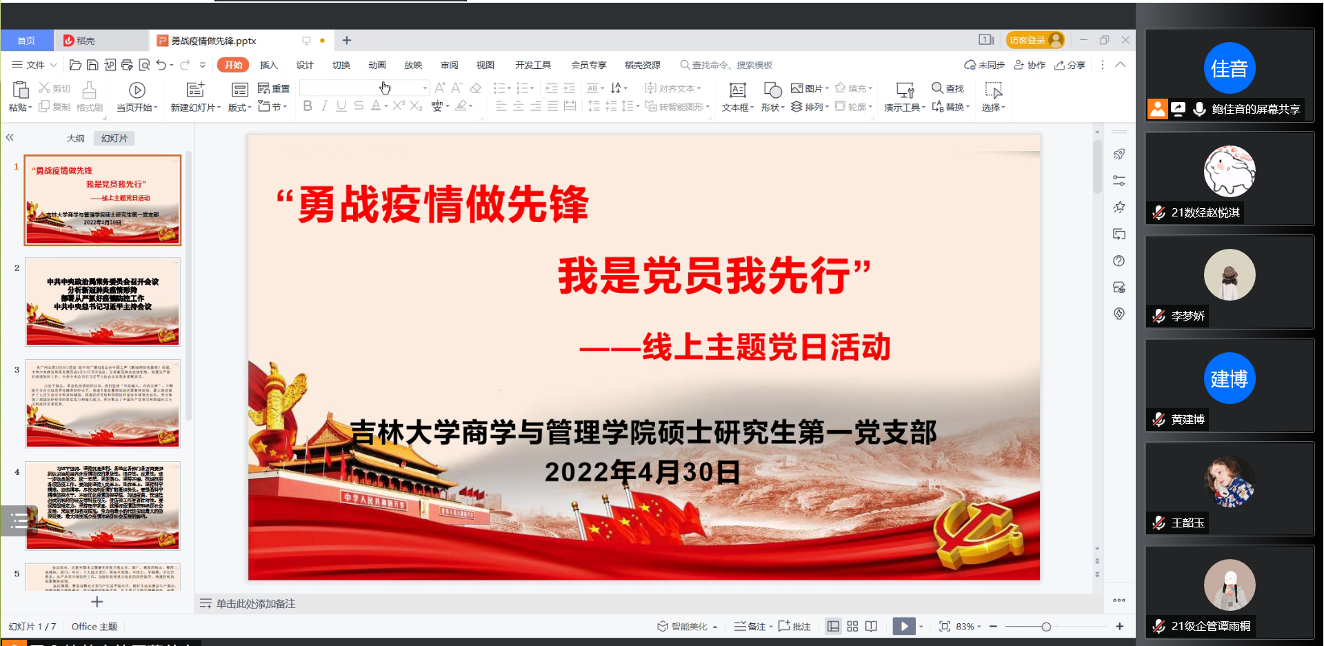 2022年4月30日,365英国上市公司硕士研究生第一党支部在线上开展以“勇战疫情做先锋 我是党员我先行”抗击疫情为主题的党日活动。365英国上市公司硕士研究生第一党支部全体党员参加了此次的线上活动。
