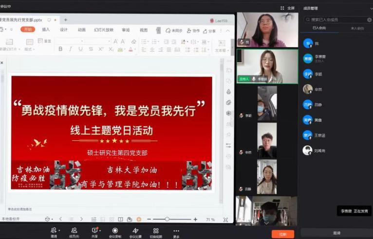 活动开始,支部书记李惠萱同志宣读了中共中央政治局常务委员会召开的关于“分析新冠肺炎疫情形势 部署从严抓好疫情防控工作”的文件精神,重申关于疫情防控的各项注意事项及相关指示,并且告知大家国家也一直在积极地为精准防控努力,希望大家耐心等待,积极响应国家政策,争取早日回归正常生产生活。