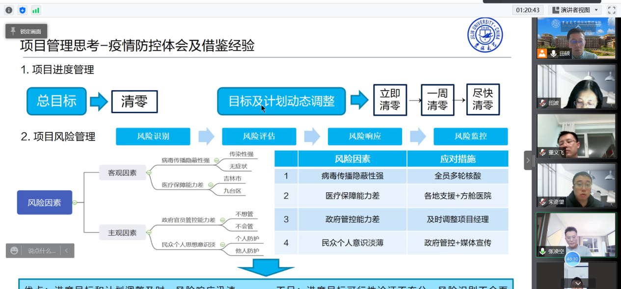 会议开始,田硕教授提出,自2020年年初新冠疫情爆发以来,我国经历了从初期的慌乱疲惫到后来的从容应对,经历了零星偶发的相对平和阶段,也经历着目前国内多点爆发、疫情卷土重来的冲击。如果将“动态清零”作为最终目标,那么对每一轮疫情的防控和处置都属于项目管理活动,而抗击疫情的一系列决策也完全可以运用项目管理理论来加以分析和解读。