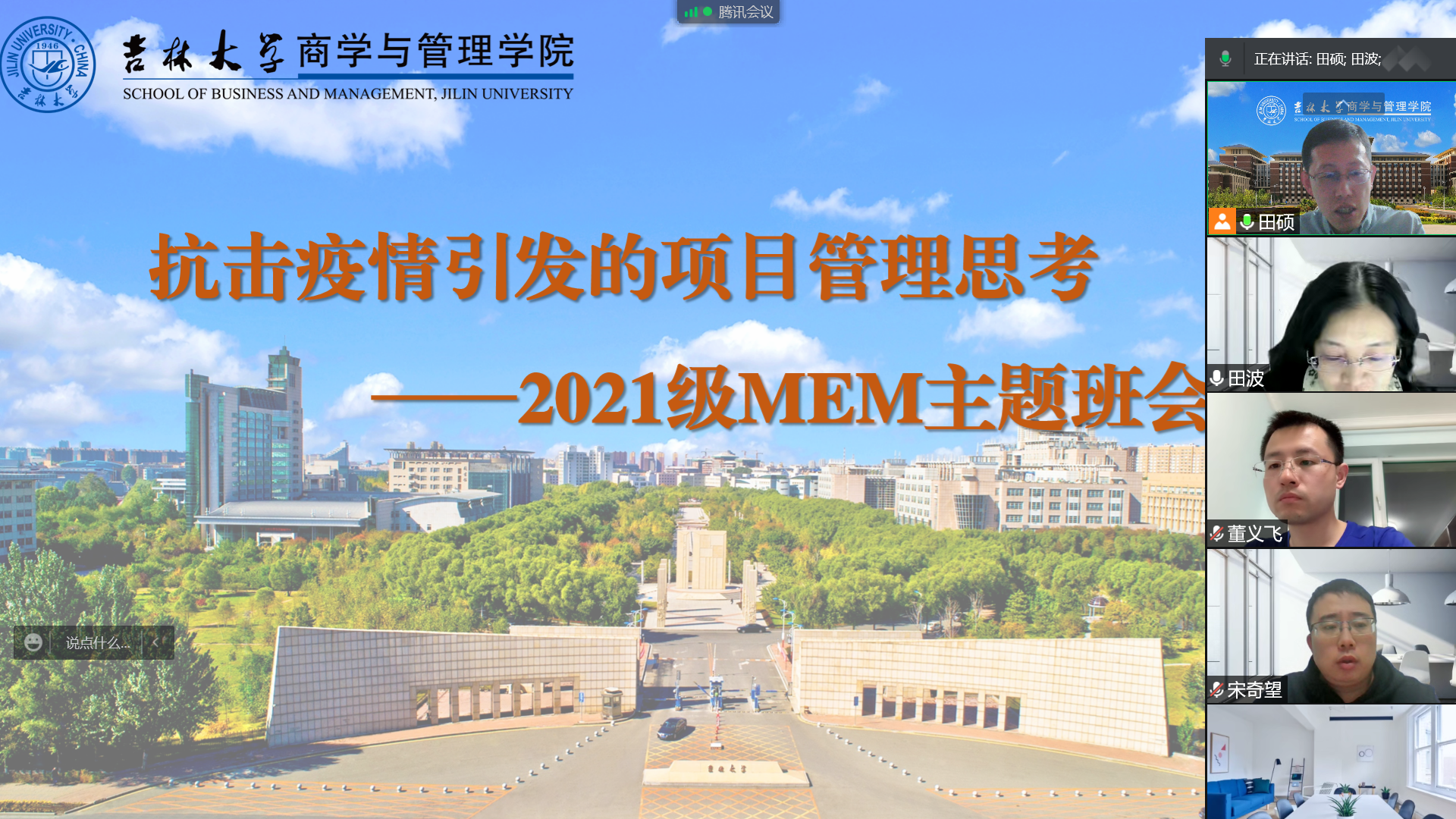 为切实关注疫情期间员工生活、学习及心理状态,促进师生间的交流沟通,排解在线学习中的困扰,365英国上市公司工程管理系主任田波教授、2021级MEM班主任田硕教授组织召开“抗击疫情引发的项目管理思考”主题班会,2021级MEM班全体学员共同参会。