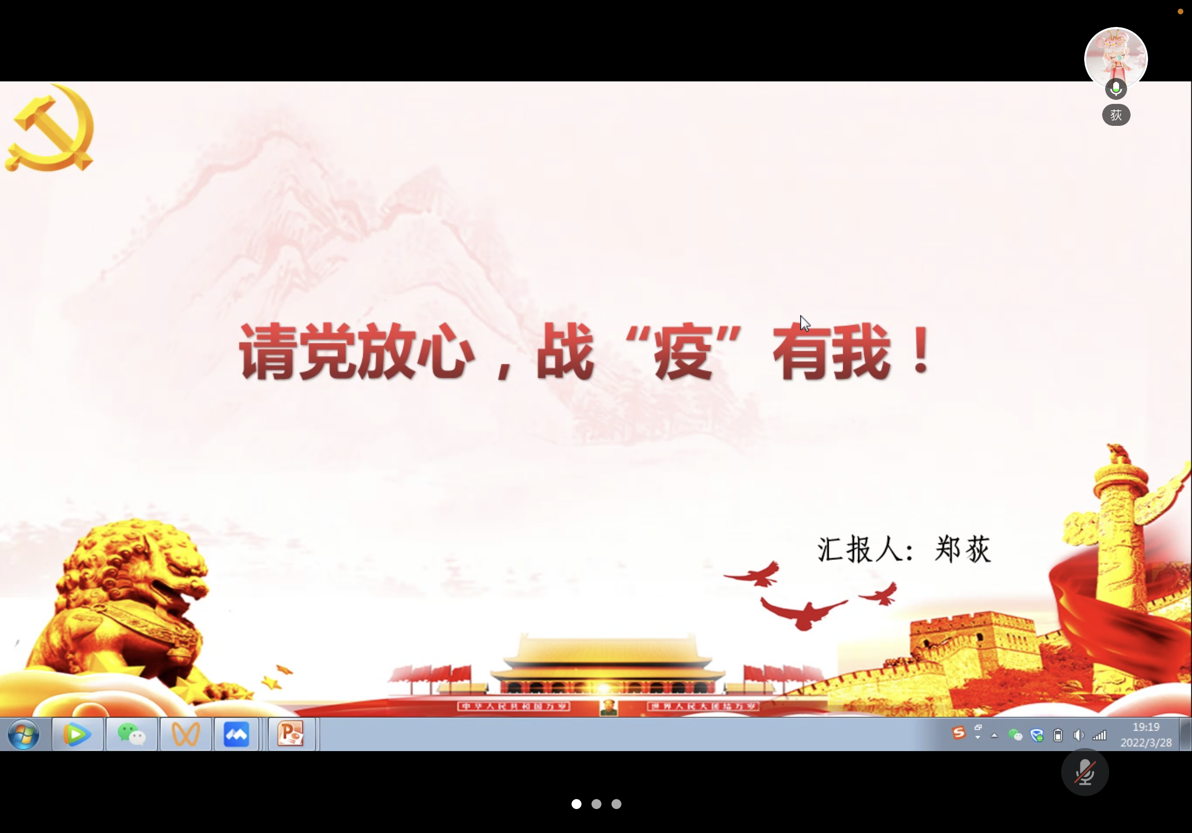 紧接着,支部党员孙祎和郑荻同志分别结合自身所处校内及校外抗疫经历,从疫情期间的所做、所见、所闻、所感出发,分享自身学习、生活及志愿服务经历,并对不辞辛苦共同抗疫的老师们表达了真诚的感谢,并鼓励支部党员积极投身于志愿服务工作中。