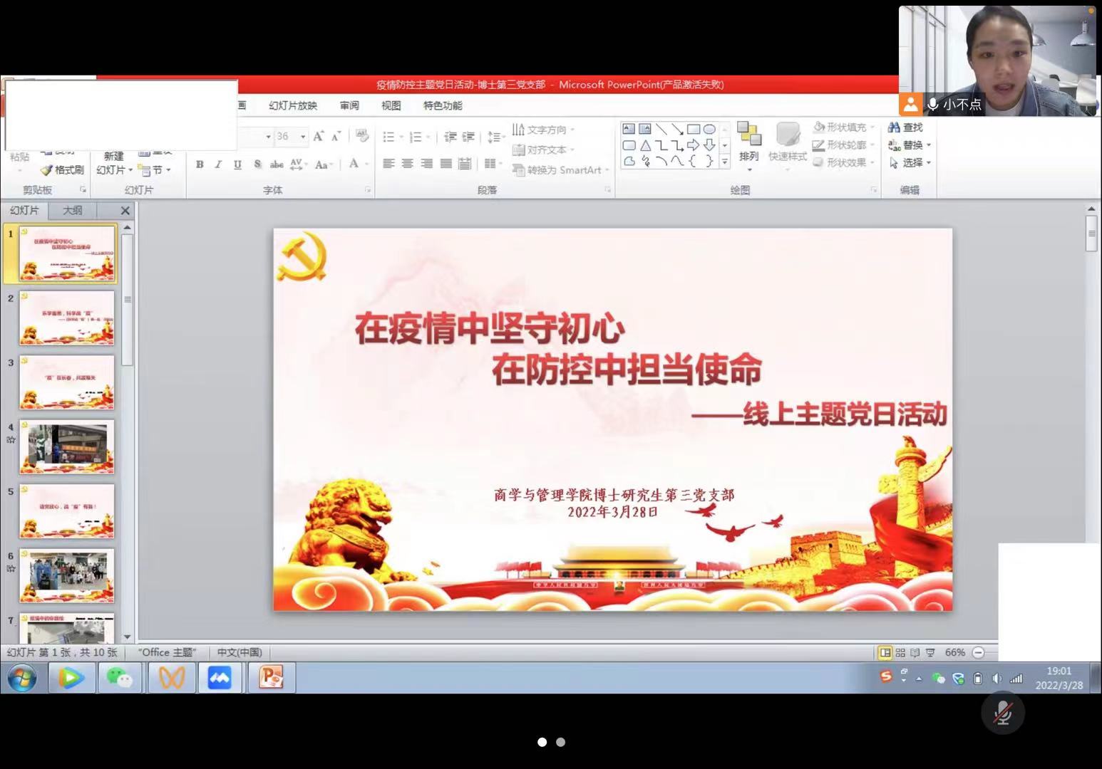 2022年3月28日晚,365英国上市公司博士研究生第三党支部在线上腾讯会议开展了以“在疫情中坚守初心,在防控中担当使命”为主题的党日活动,鼓励支部党员投身于抗击疫情的工作中,坚守初心共同抗疫。