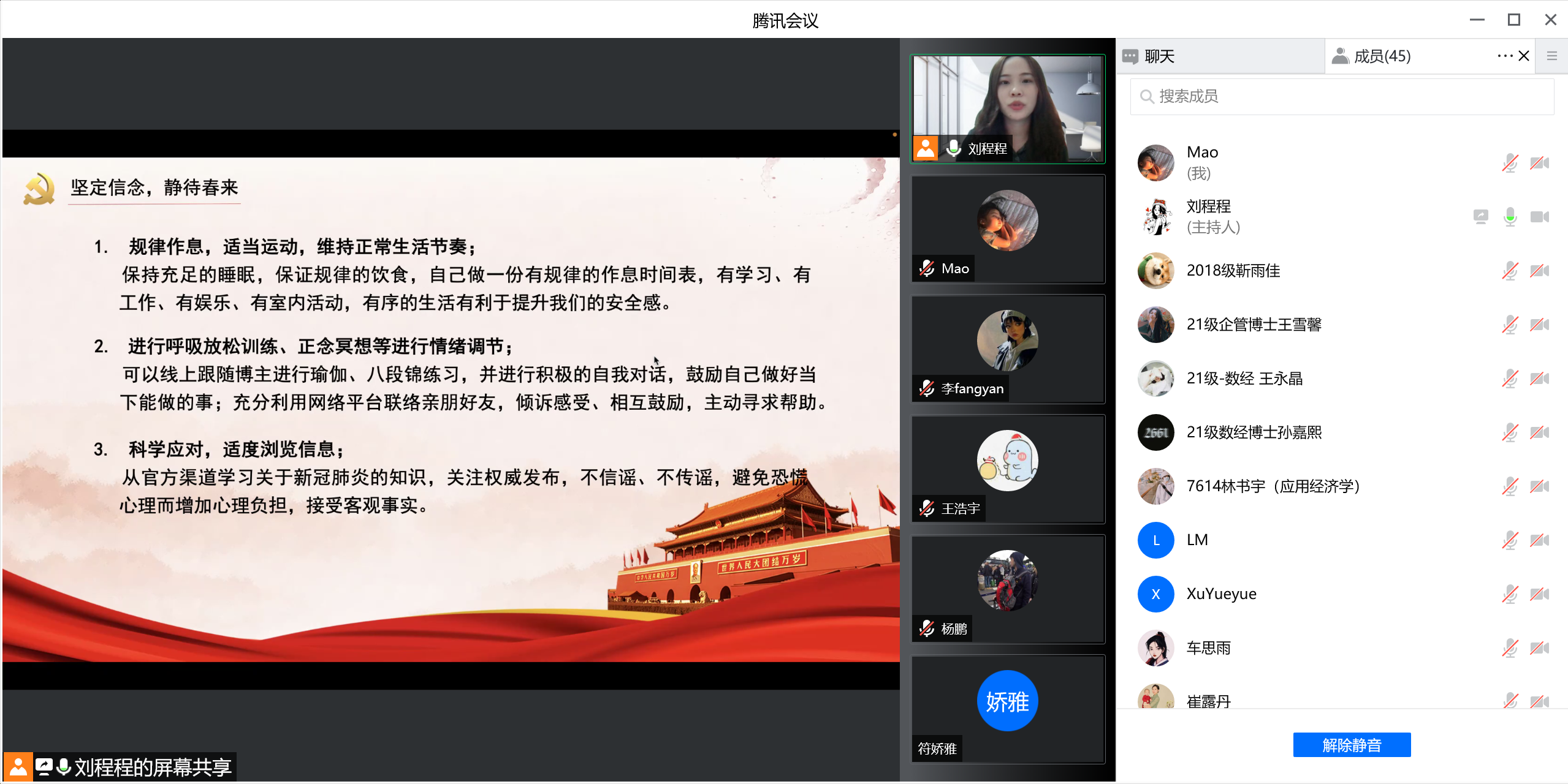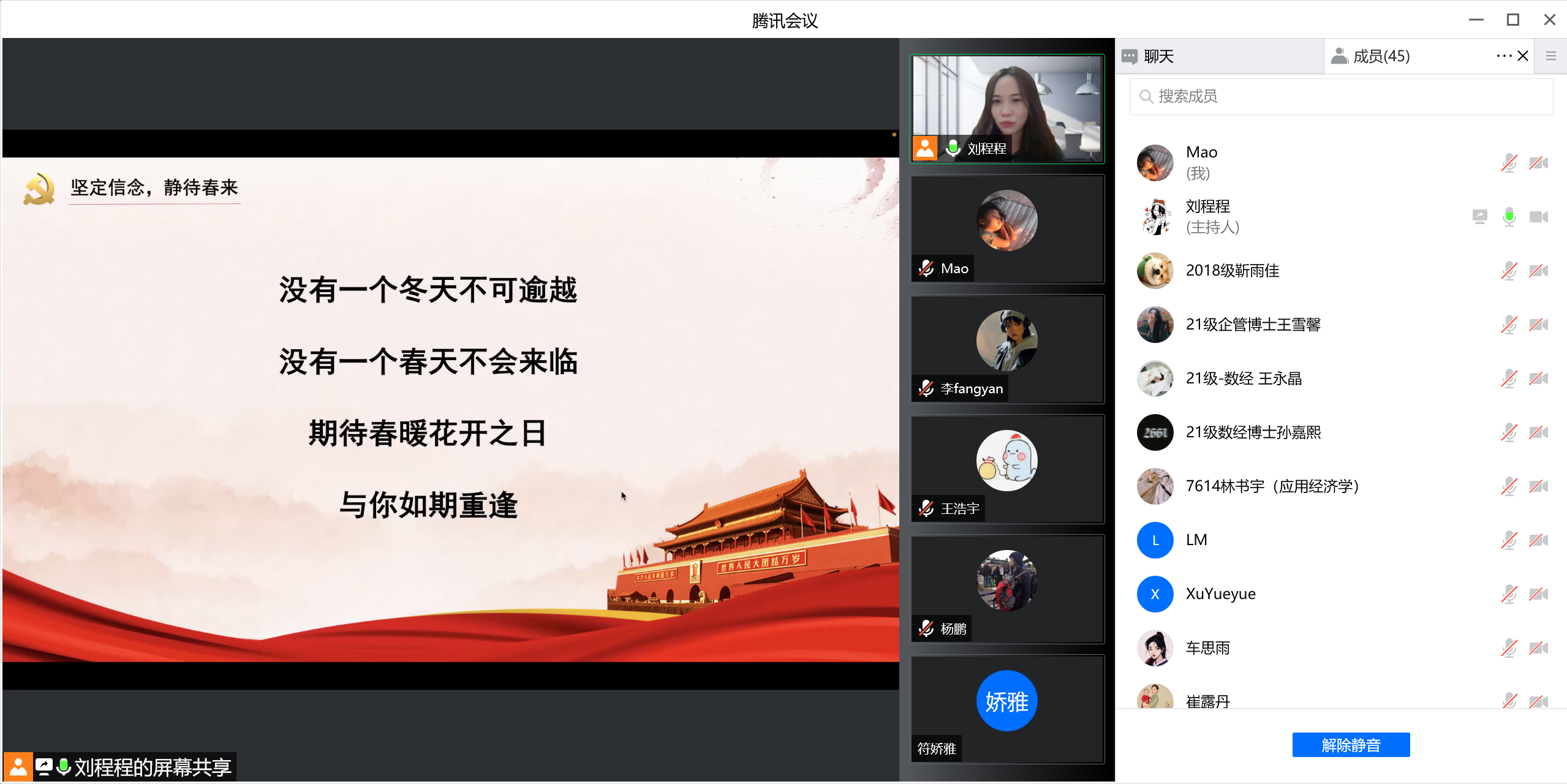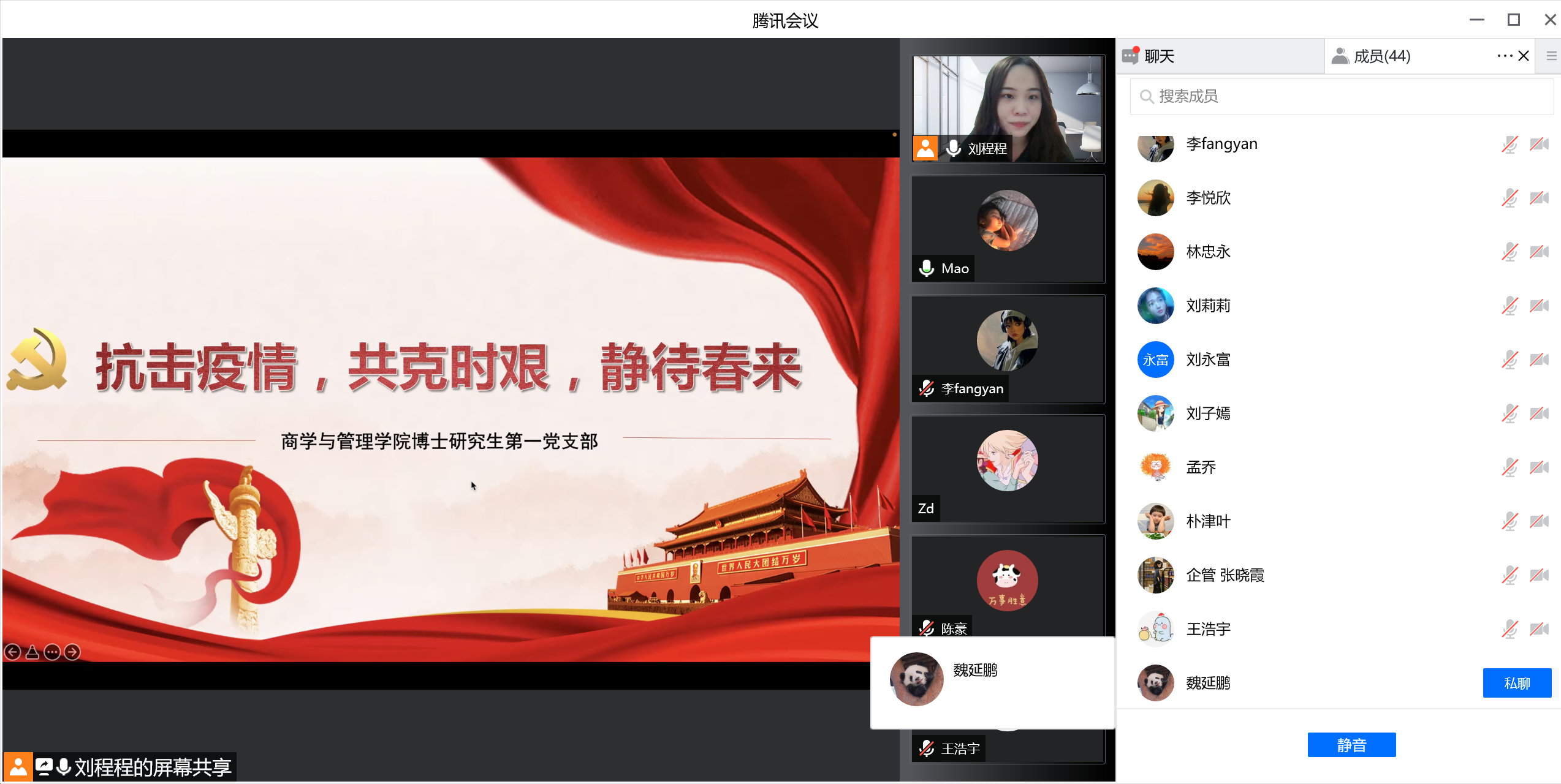 为深入贯彻习近平总书记关于疫情防控工作重要指示批示精神,积极应对当前复杂严峻的疫情防控形势,2022年3月25日,365英国上市公司博士研究生第一党支部召开“抗击疫情,共克时坚,静待春来”线上主题党日活动。会议由党支部书记刘程程同志主持,刘欣苗同志与谢敬轩同志记录,支部有44名党员和团员共同参加。