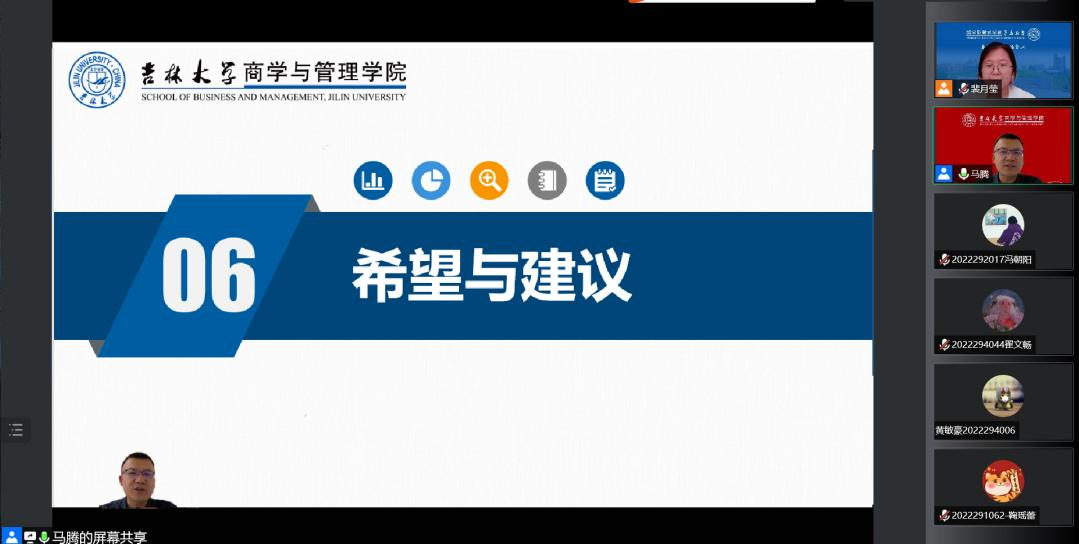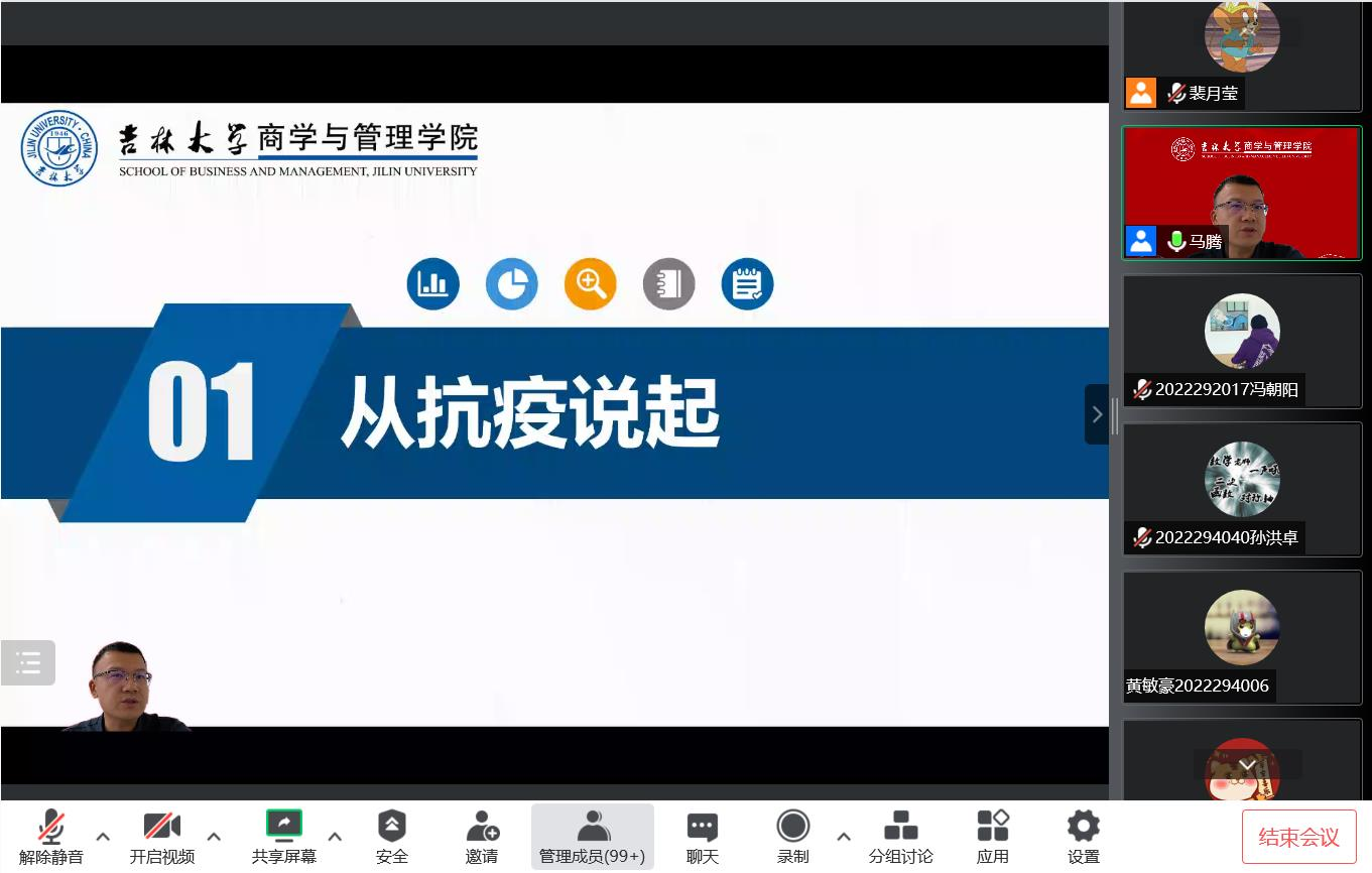 会议伊始,马腾老师对全体2022级研究生新生的到来表示热烈欢迎。随后,马腾老师从上半年的抗疫经历说起,用详实的数据和鲜活的案例为大家讲述了抗疫期间我们身边发生的真实故事,包括驻楼老师和员工志愿者的日常工作等。大家不仅从中感受到了抗疫的艰辛,还有老师和同学们的温暖与担当。马腾老师表示,希望大家可以将抗疫期间商管学子的青年担当和良好品格继续学习和传承下去。